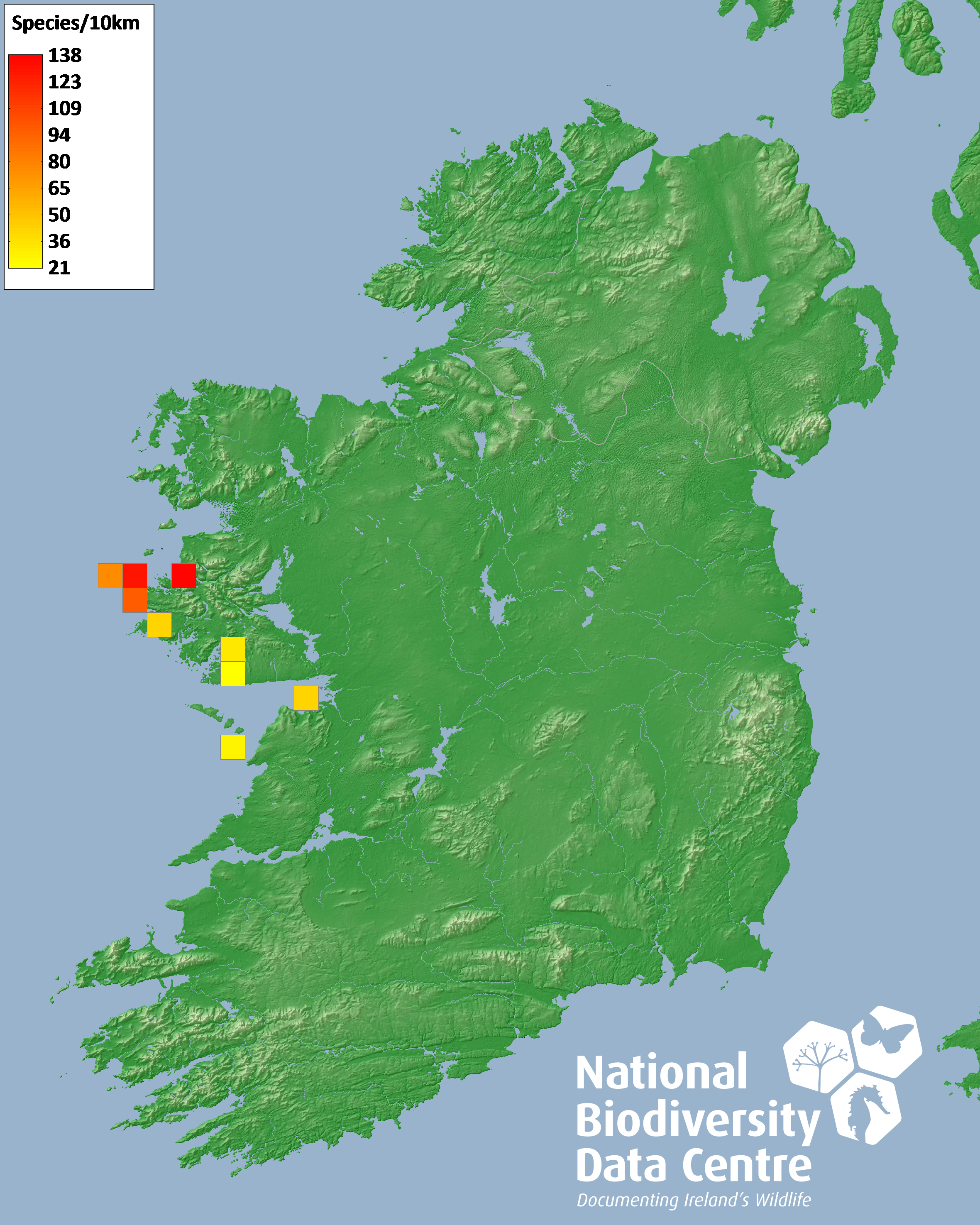 Distribution of the number of species recorded within each 10km grid square (ITM).Marine Map - 50Km