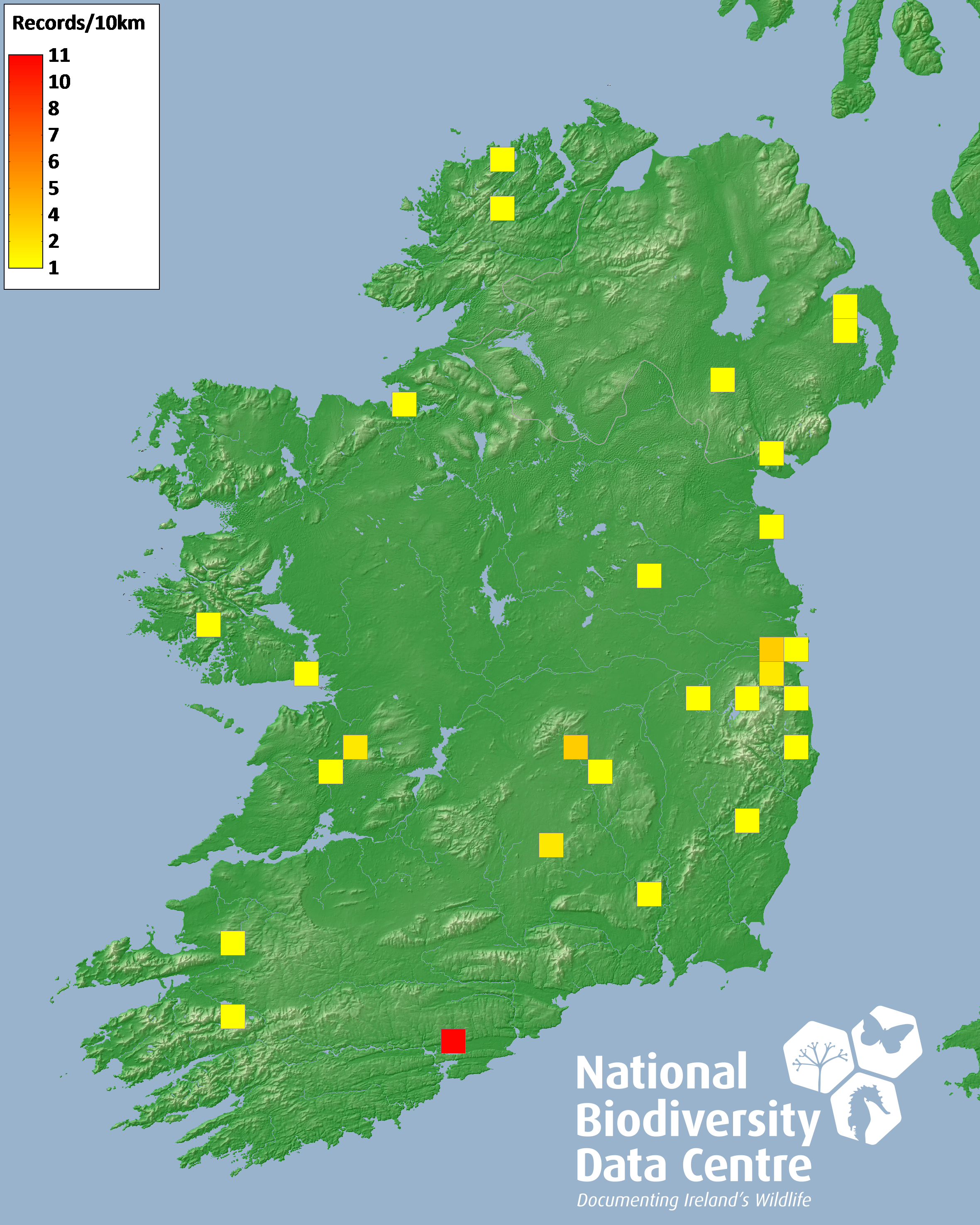 Distribution of the number of records recorded within each 10km grid square (ITM).Marine Map - 50km
