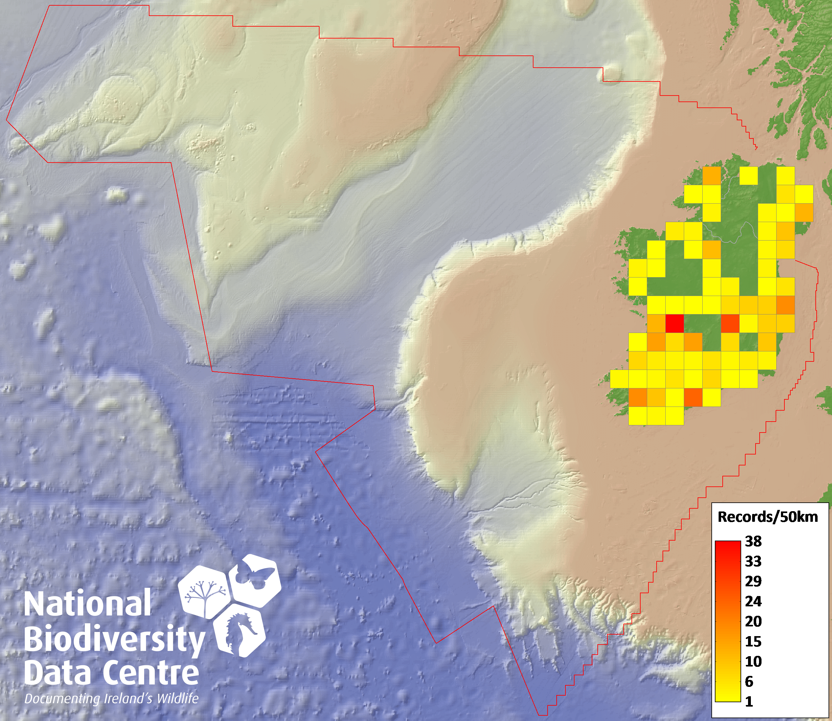 Distribution of the number of records recorded within each 10km grid square (ITM).Marine Map - 50km