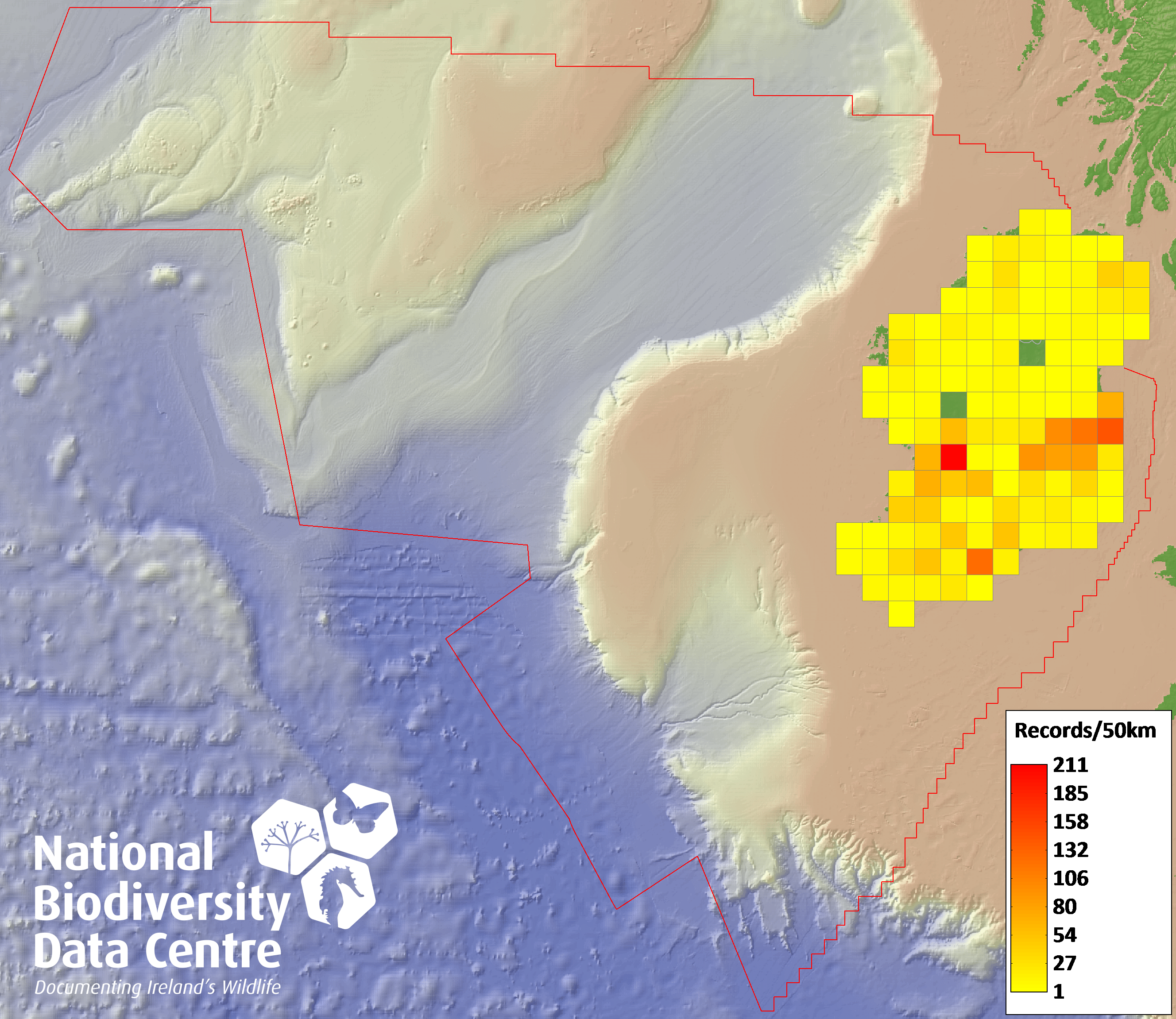 Distribution of the number of records recorded within each 10km grid square (ITM).Marine Map - 50km