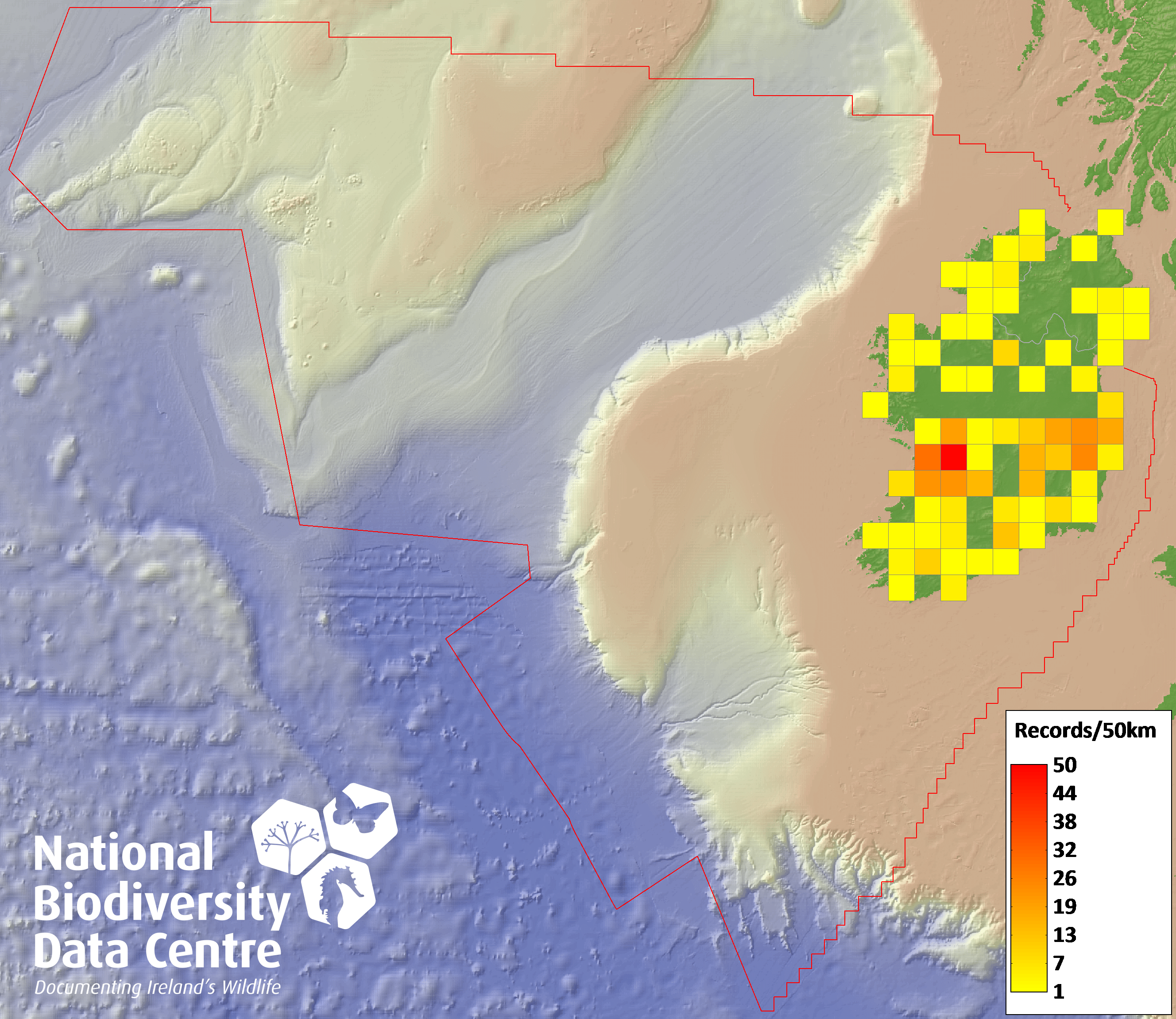 Distribution of the number of records recorded within each 10km grid square (ITM).Marine Map - 50km