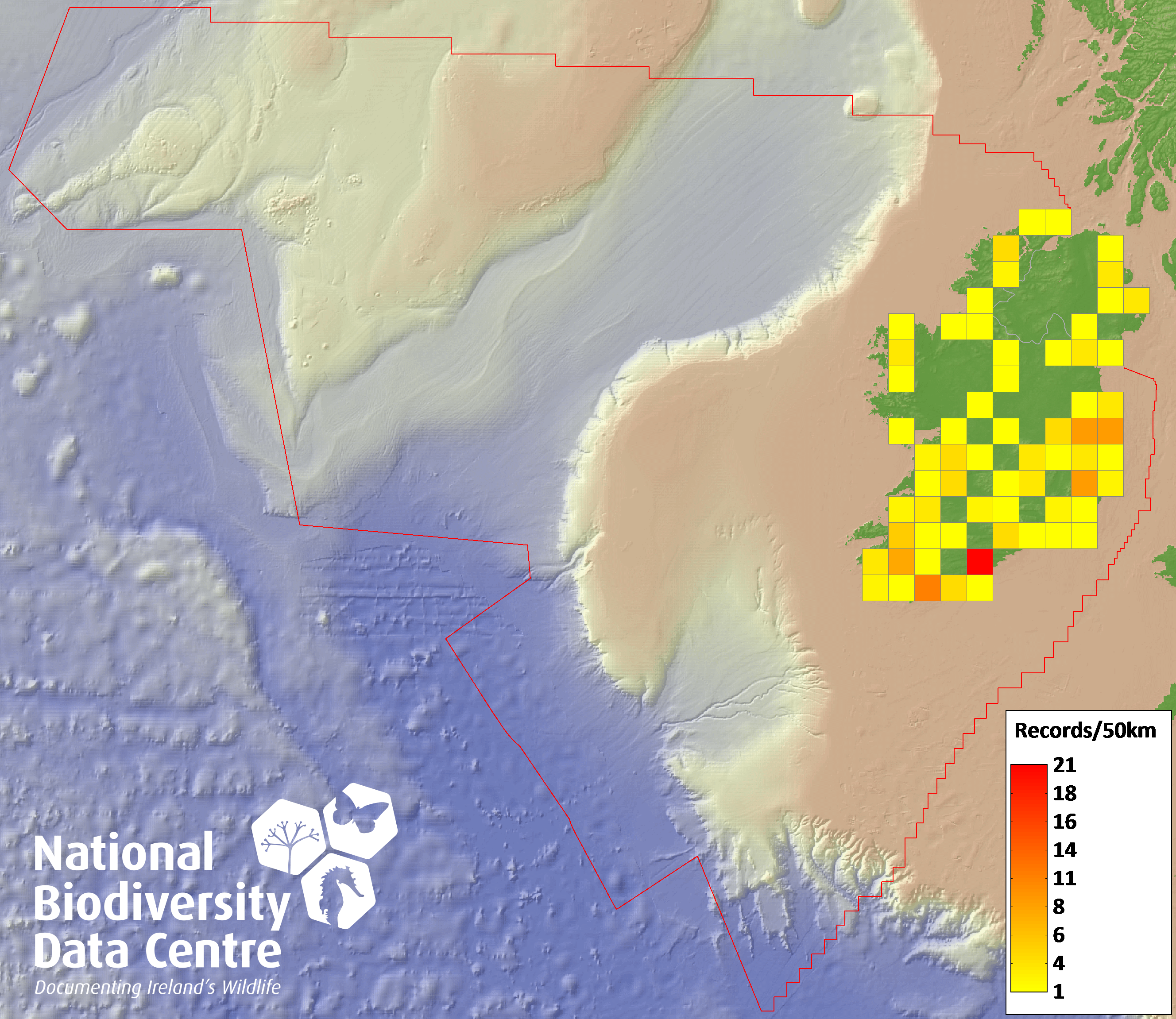 Distribution of the number of records recorded within each 10km grid square (ITM).Marine Map - 50km