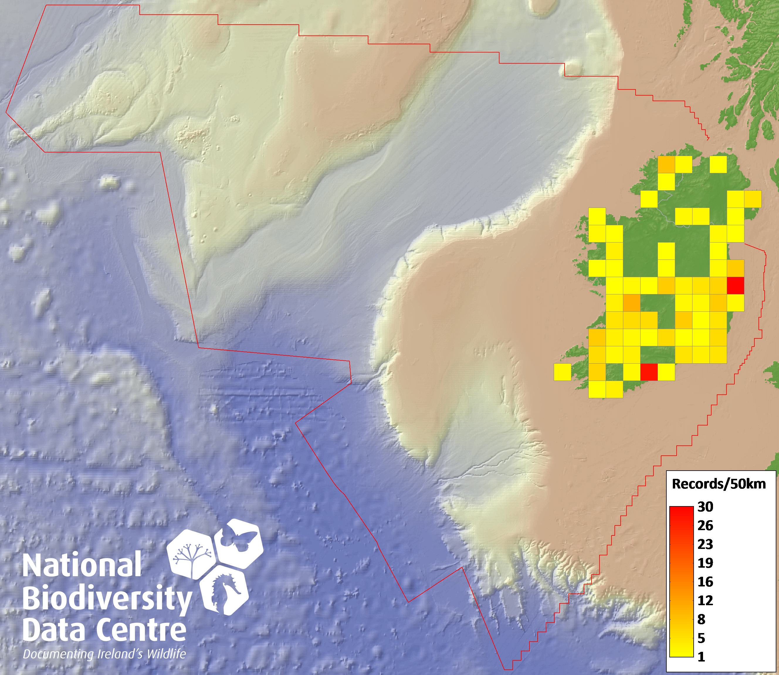 Distribution of the number of records recorded within each 10km grid square (ITM).Marine Map - 50km