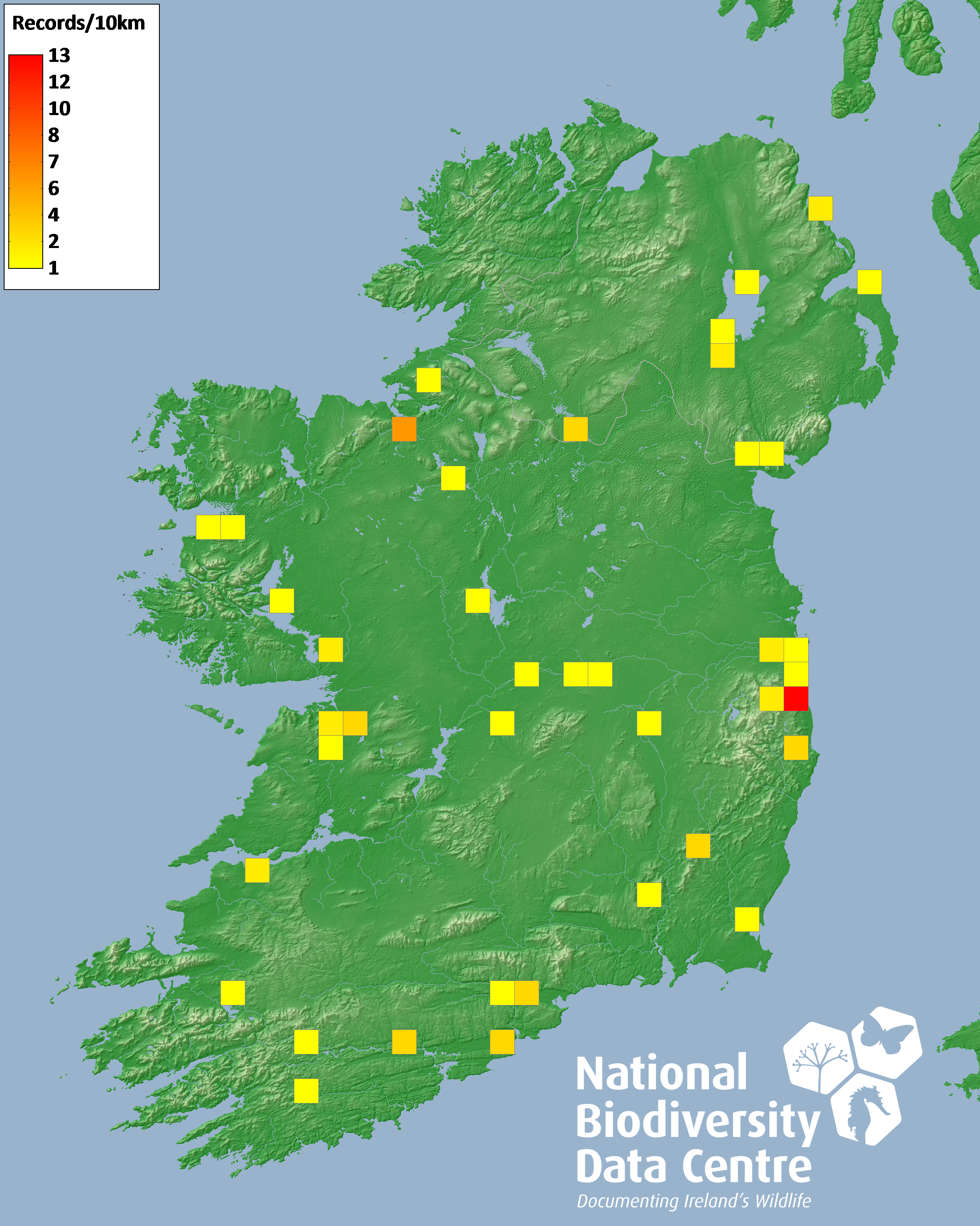 Distribution of the number of records recorded within each 10km grid square (ITM).Marine Map - 50km