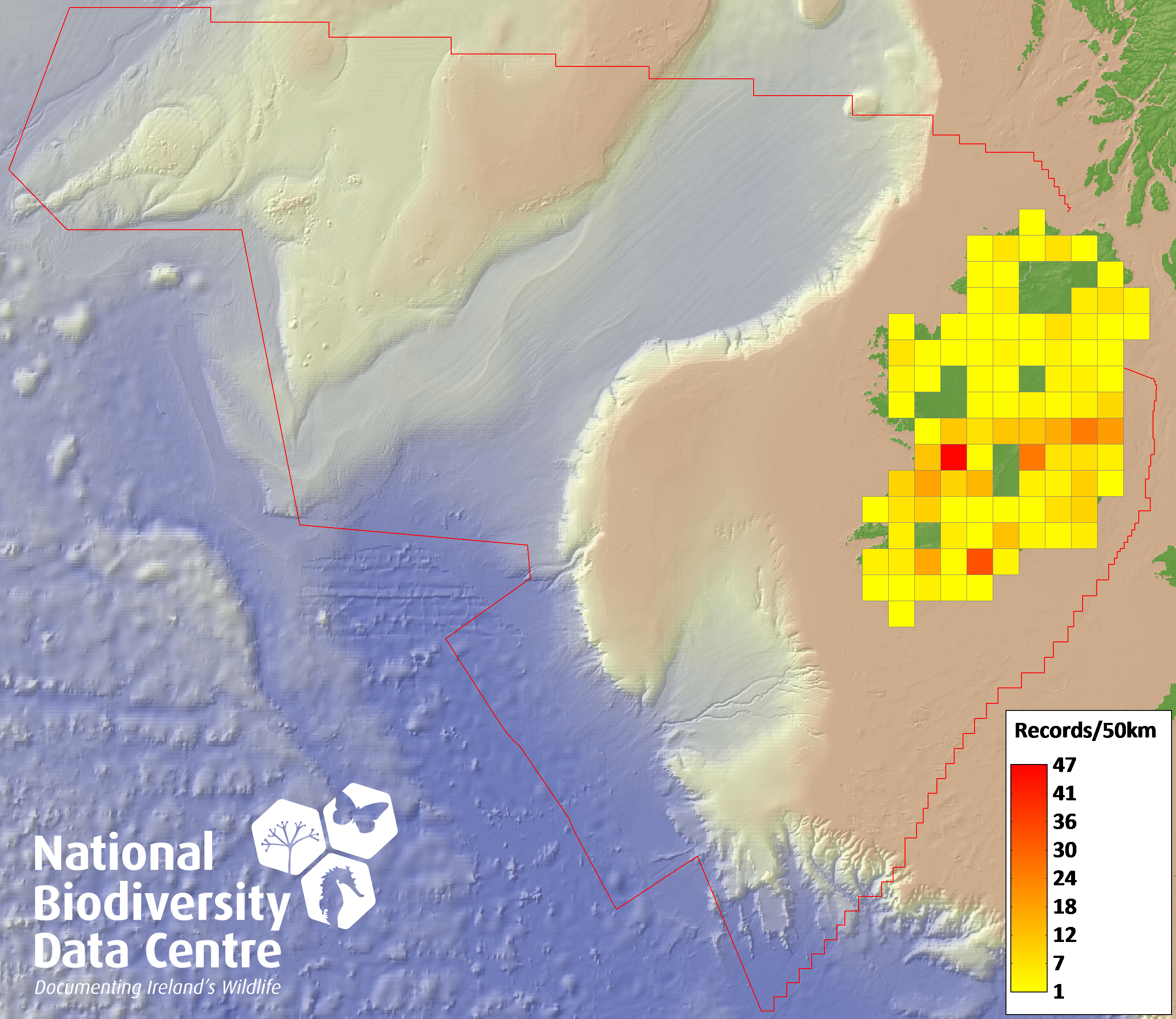 Distribution of the number of records recorded within each 10km grid square (ITM).Marine Map - 50km