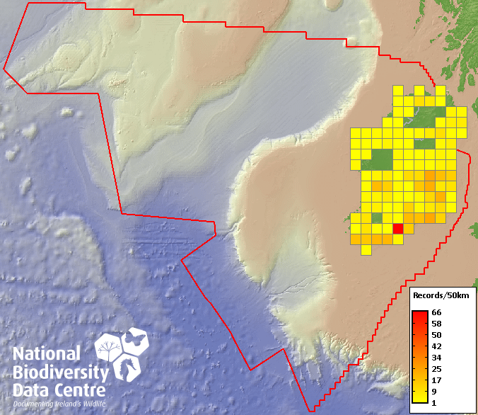 Distribution of the number of records recorded within each 10km grid square (ITM).Marine Map - 50km