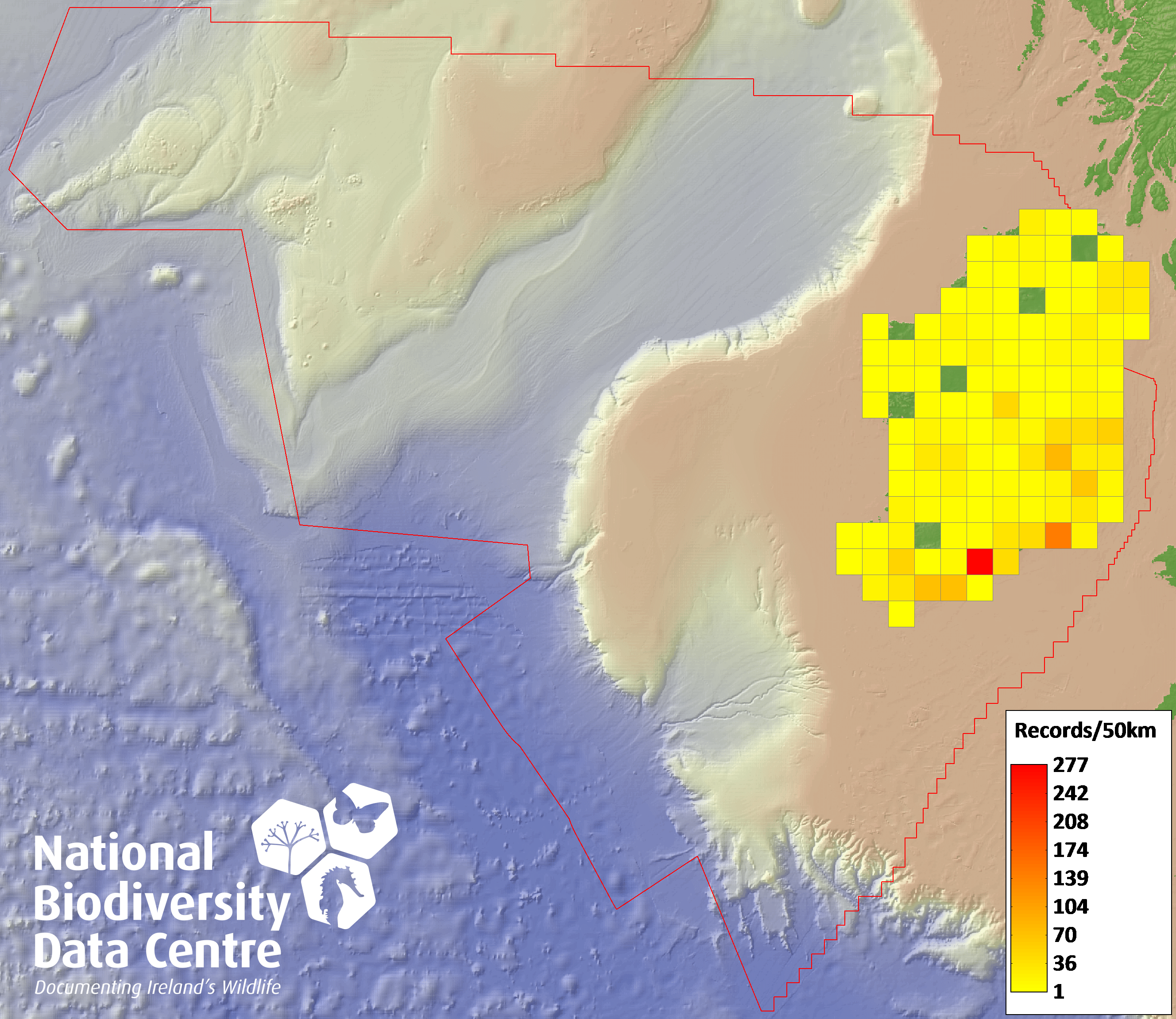 Distribution of the number of records recorded within each 10km grid square (ITM).Marine Map - 50km