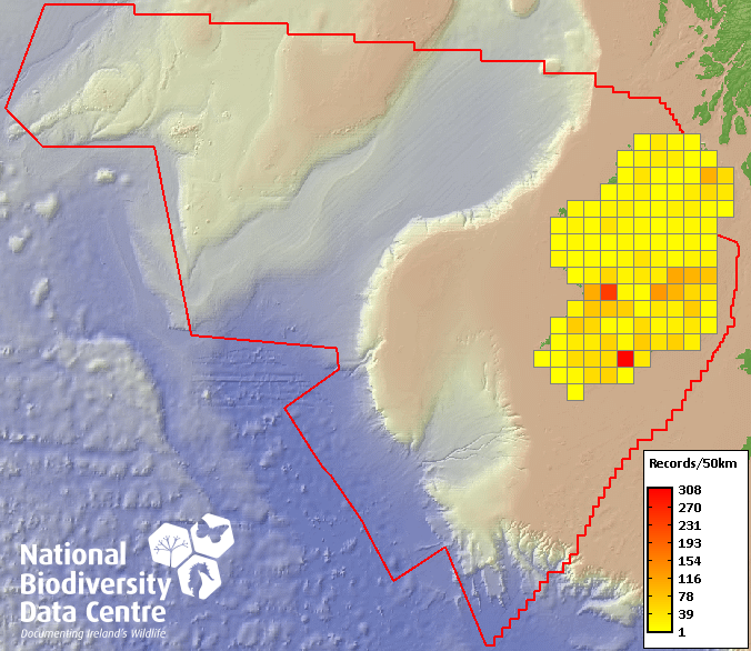 Distribution of the number of records recorded within each 10km grid square (ITM).Marine Map - 50km