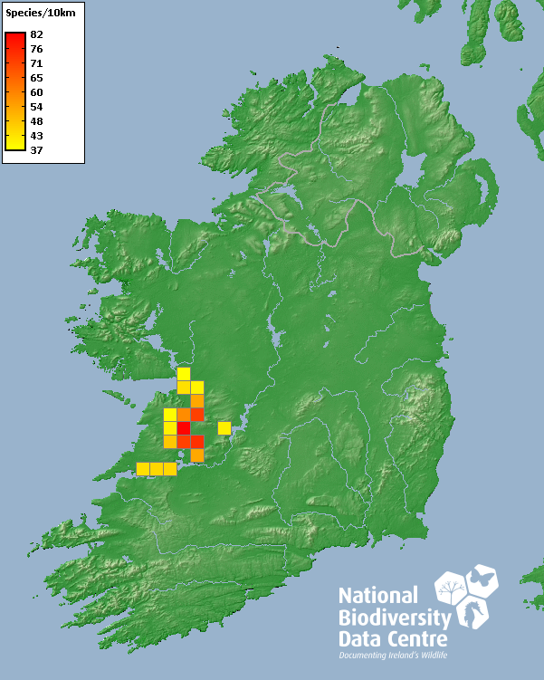 Distribution of the number of species recorded within each 10km grid square (ITM).Marine Map - 50Km
