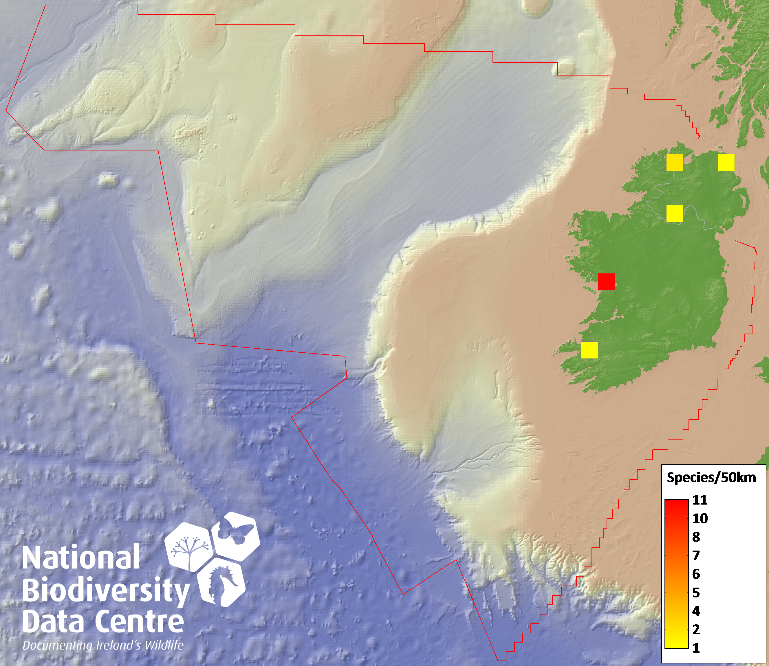 Distribution of the number of records within each 10km grid square (ITM).Marine Map - 50Km