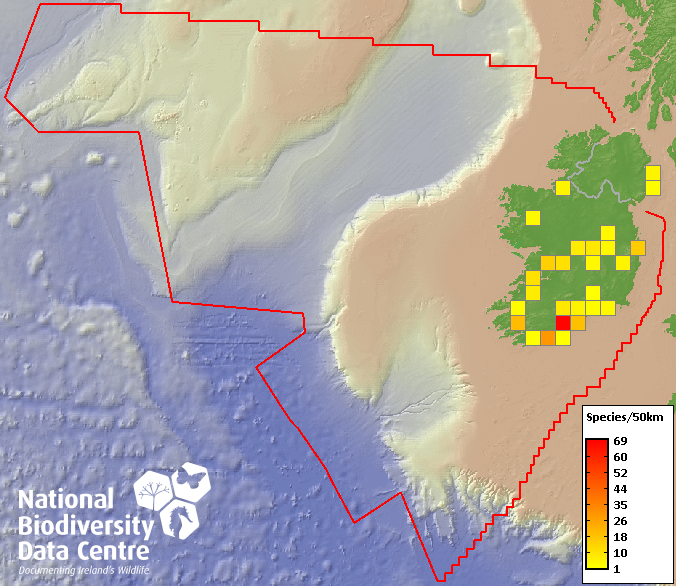 Distribution of the number of species recorded within each 10km grid square (ITM).Marine Map - 50Km