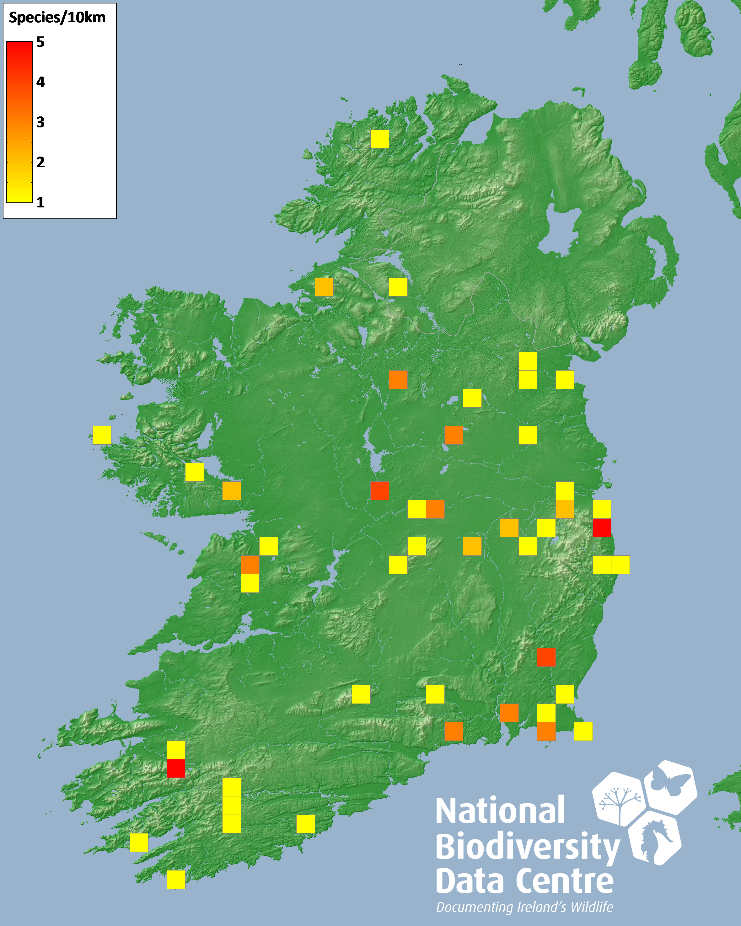 Distribution of the number of species recorded within each 10km grid square (ITM).Marine Map - 50Km