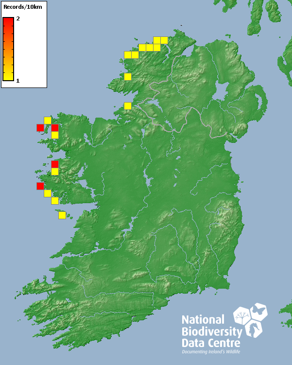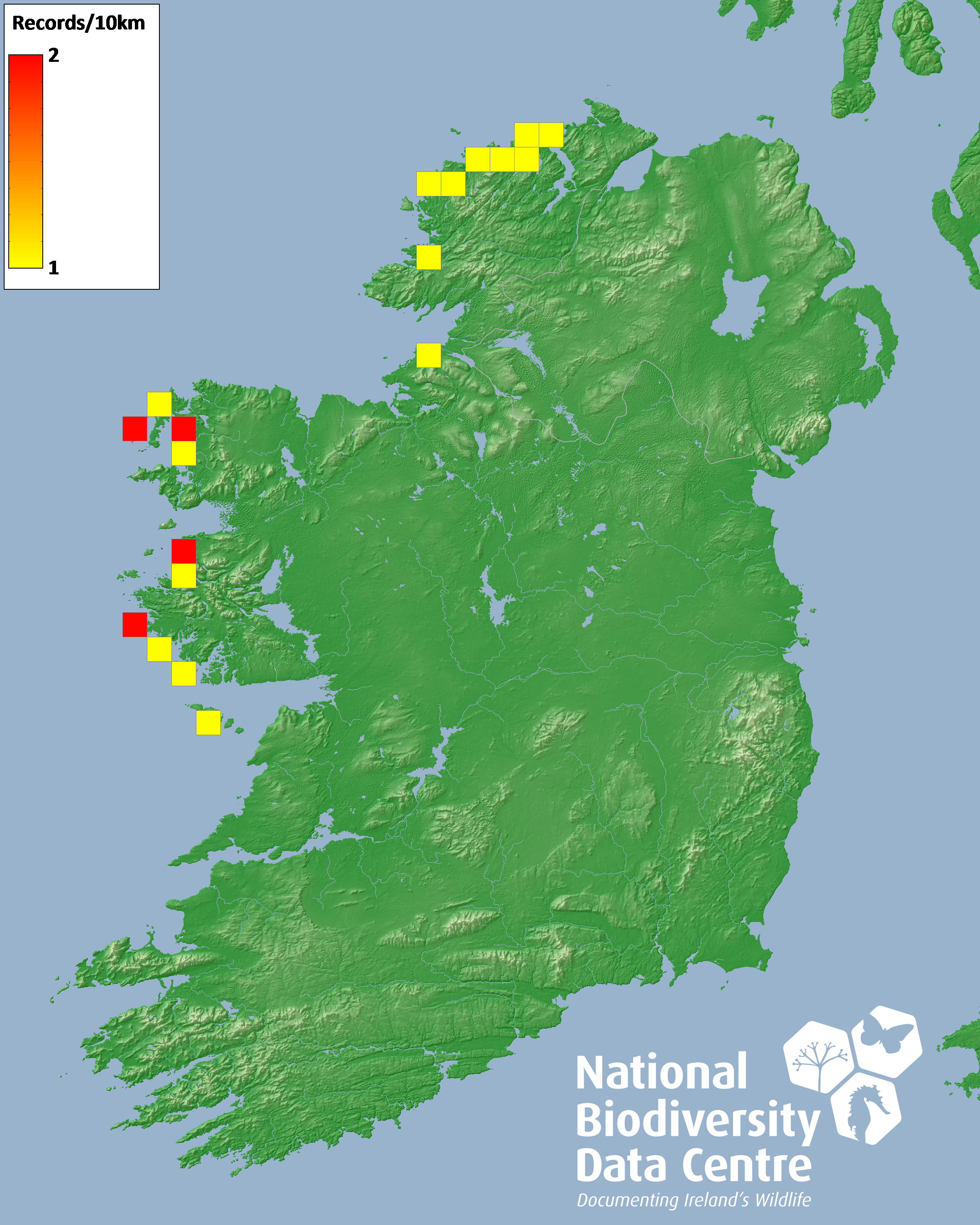 Distribution of the number of records recorded within each 10km grid square (ITM).Marine Map - 50km