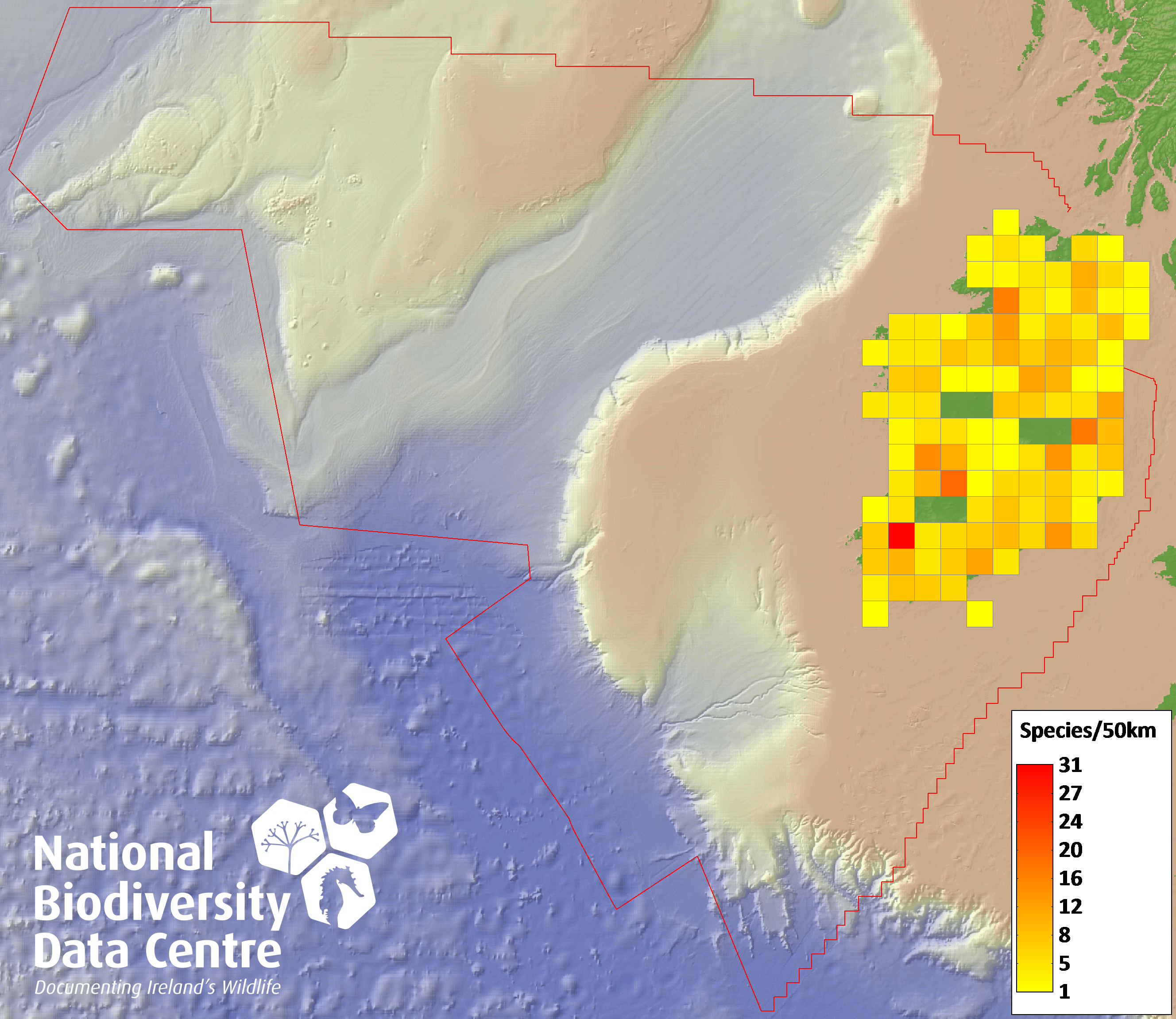 Distribution of the number of species recorded within each 10km grid square (ITM).Marine Map - 50Km