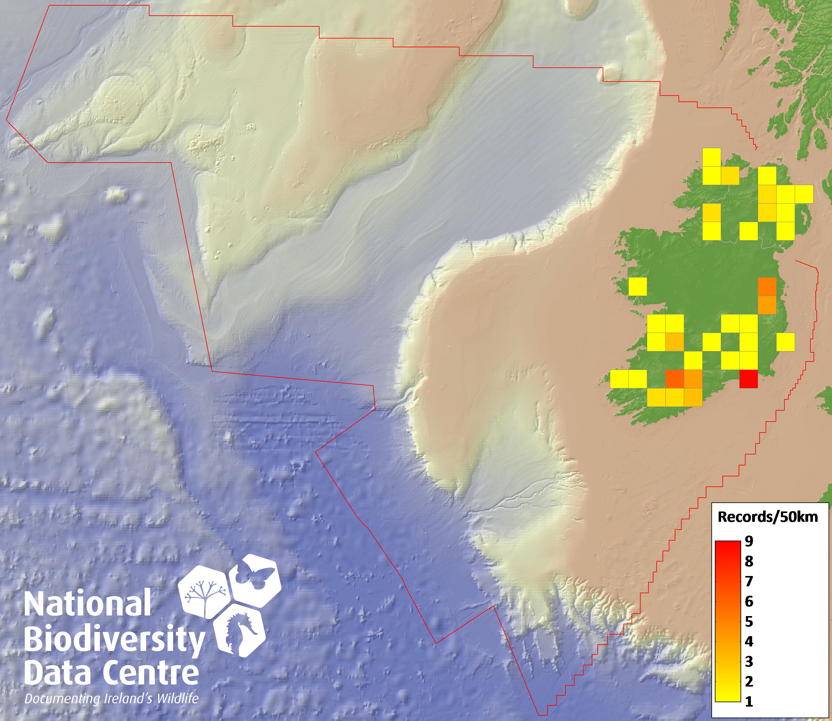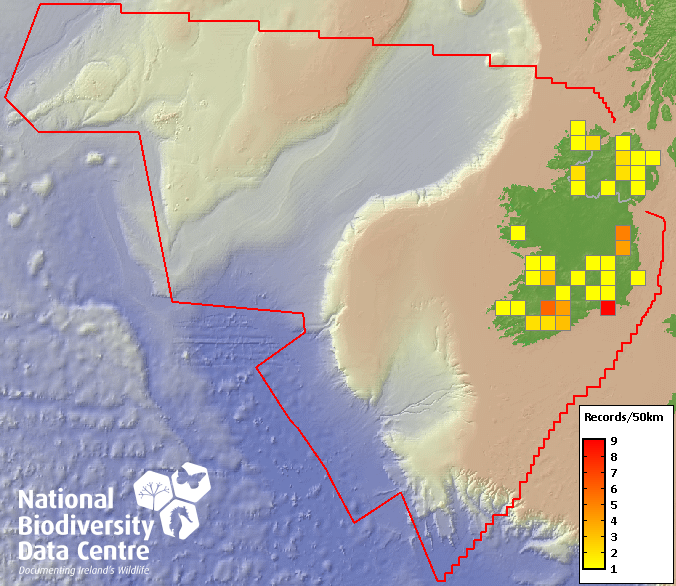 Distribution of the number of records recorded within each 10km grid square (ITM).Marine Map - 50km