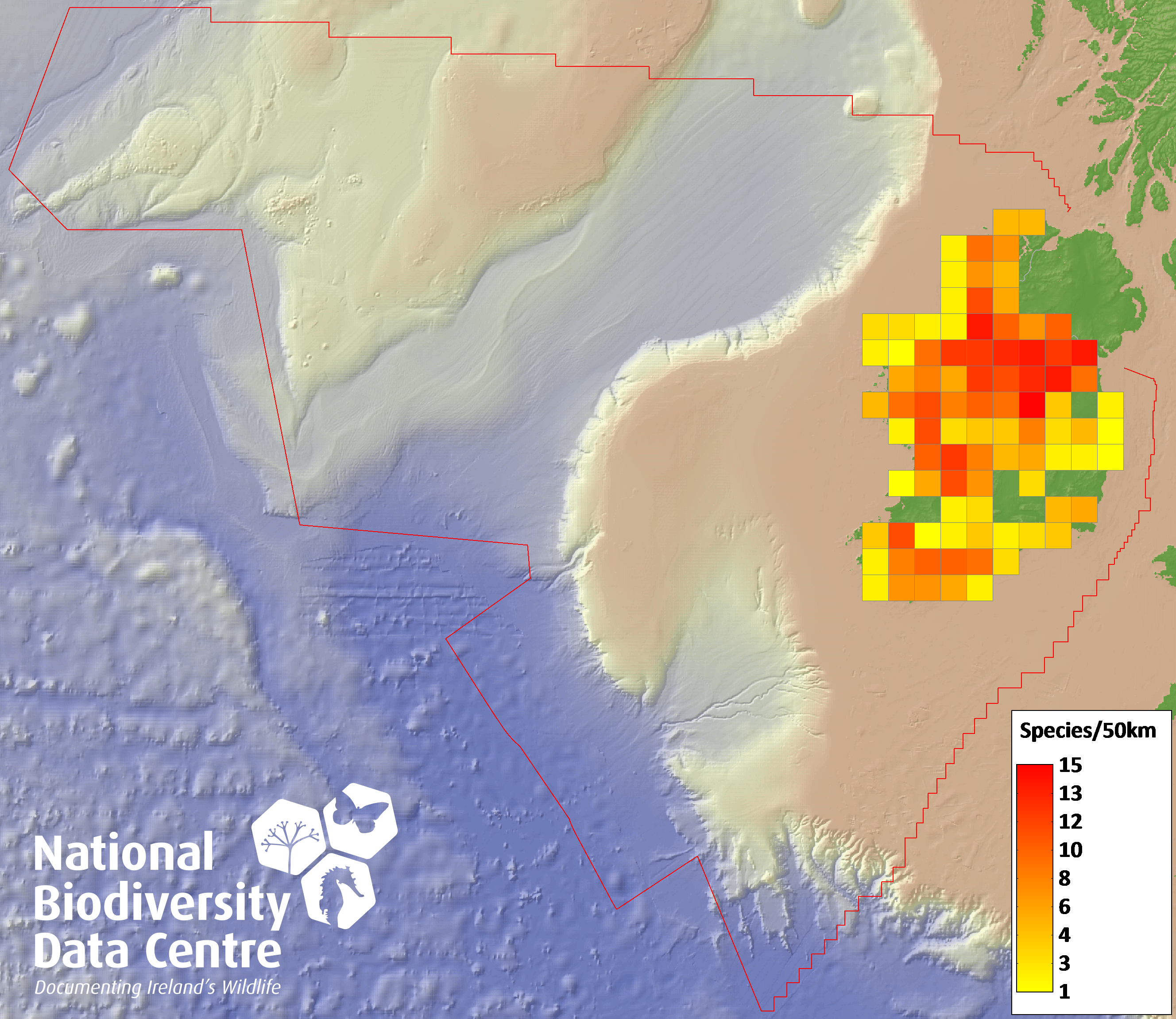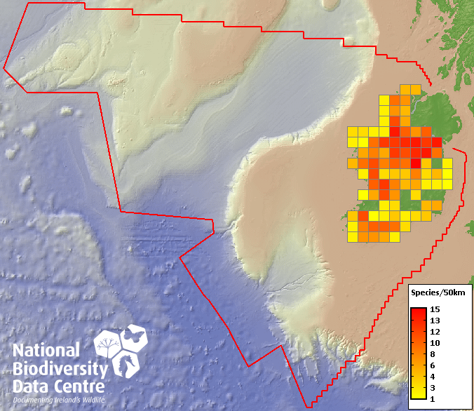 Distribution of the number of species recorded within each 10km grid square (ITM).Marine Map - 50Km