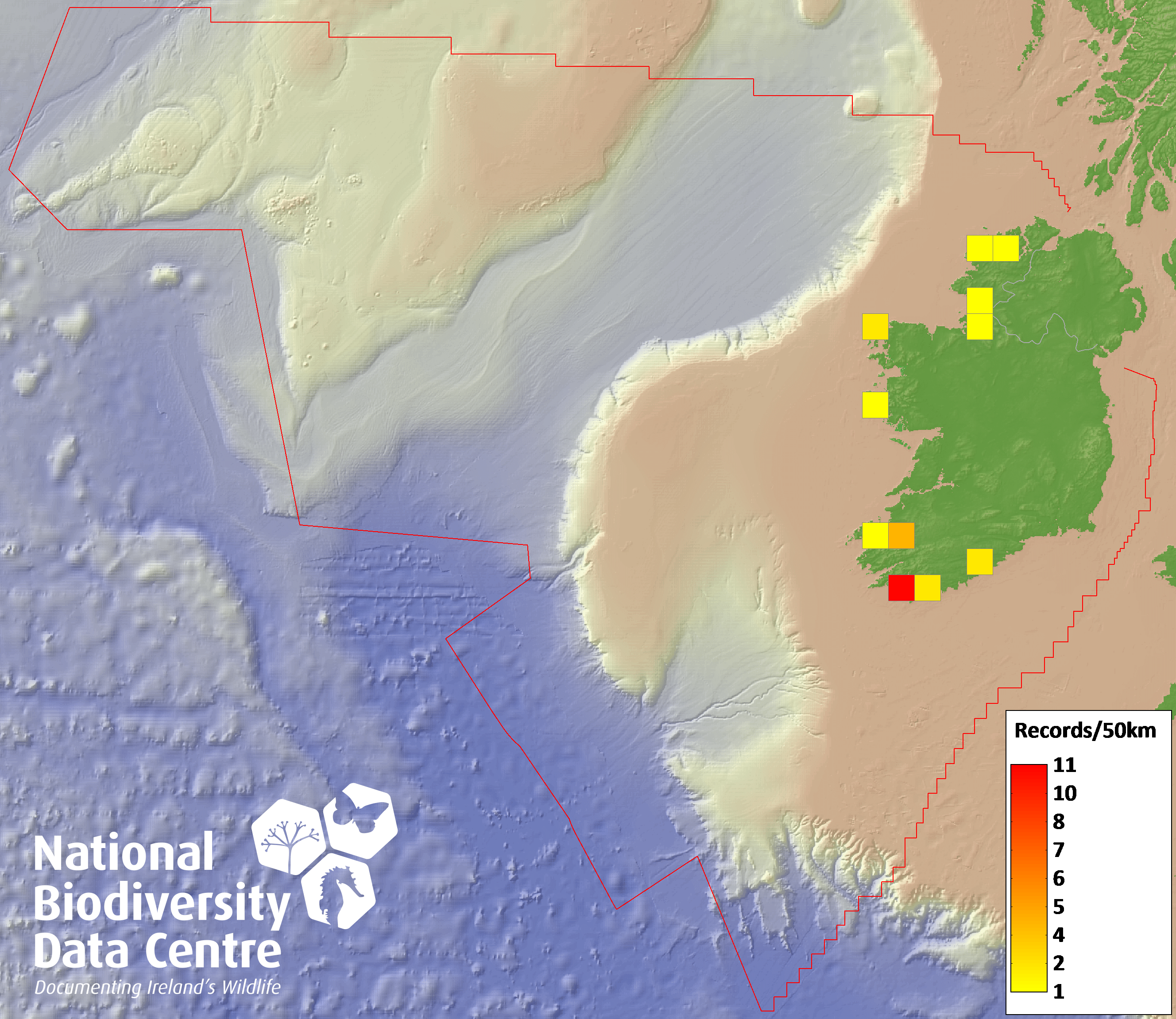 Distribution of the number of records recorded within each 10km grid square (ITM).Marine Map - 50km