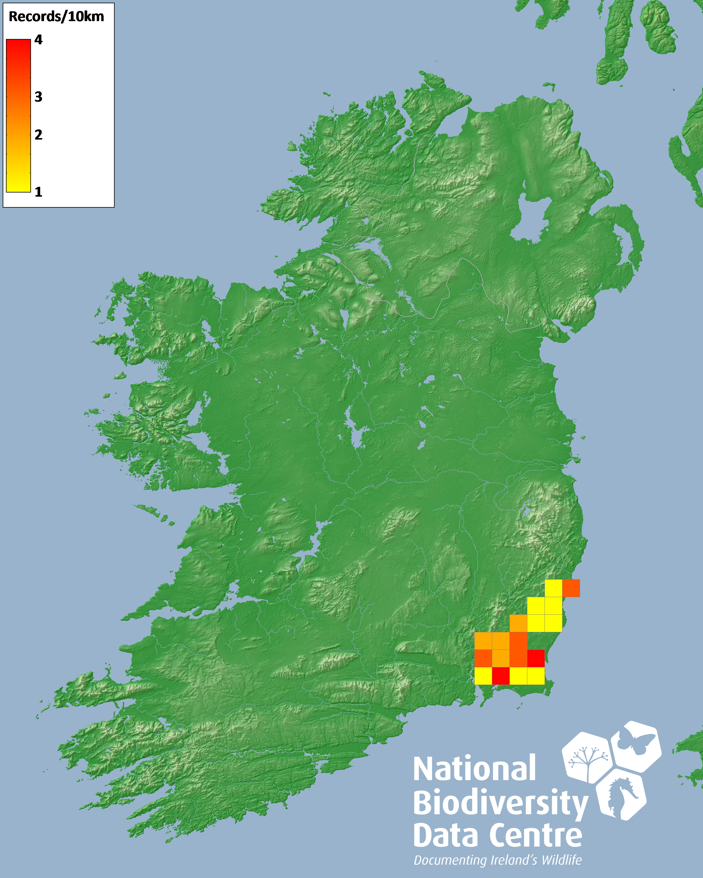 Distribution of the number of records recorded within each 10km grid square (ITM).Marine Map - 50km