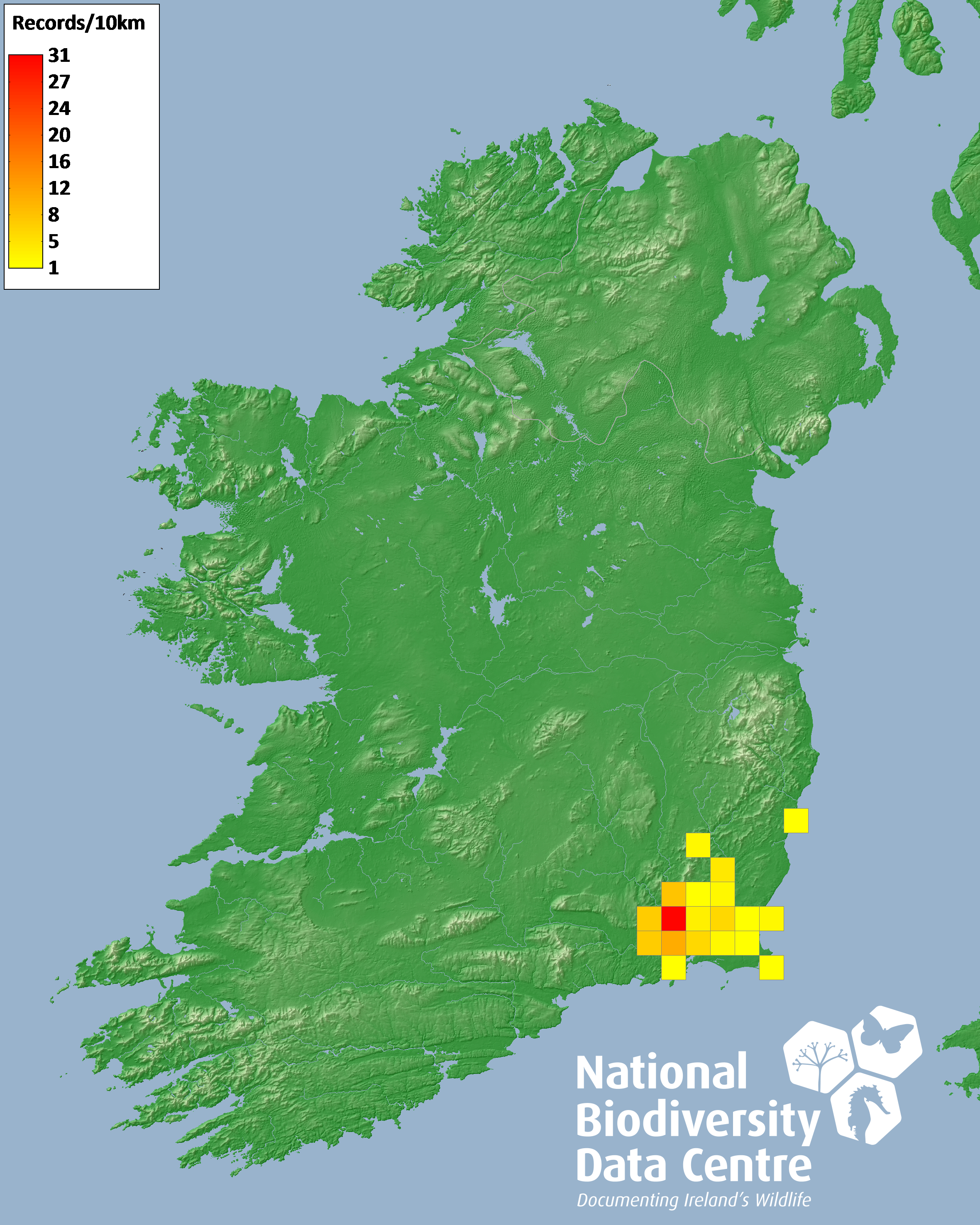 Distribution of the number of records recorded within each 10km grid square (ITM).Marine Map - 50km