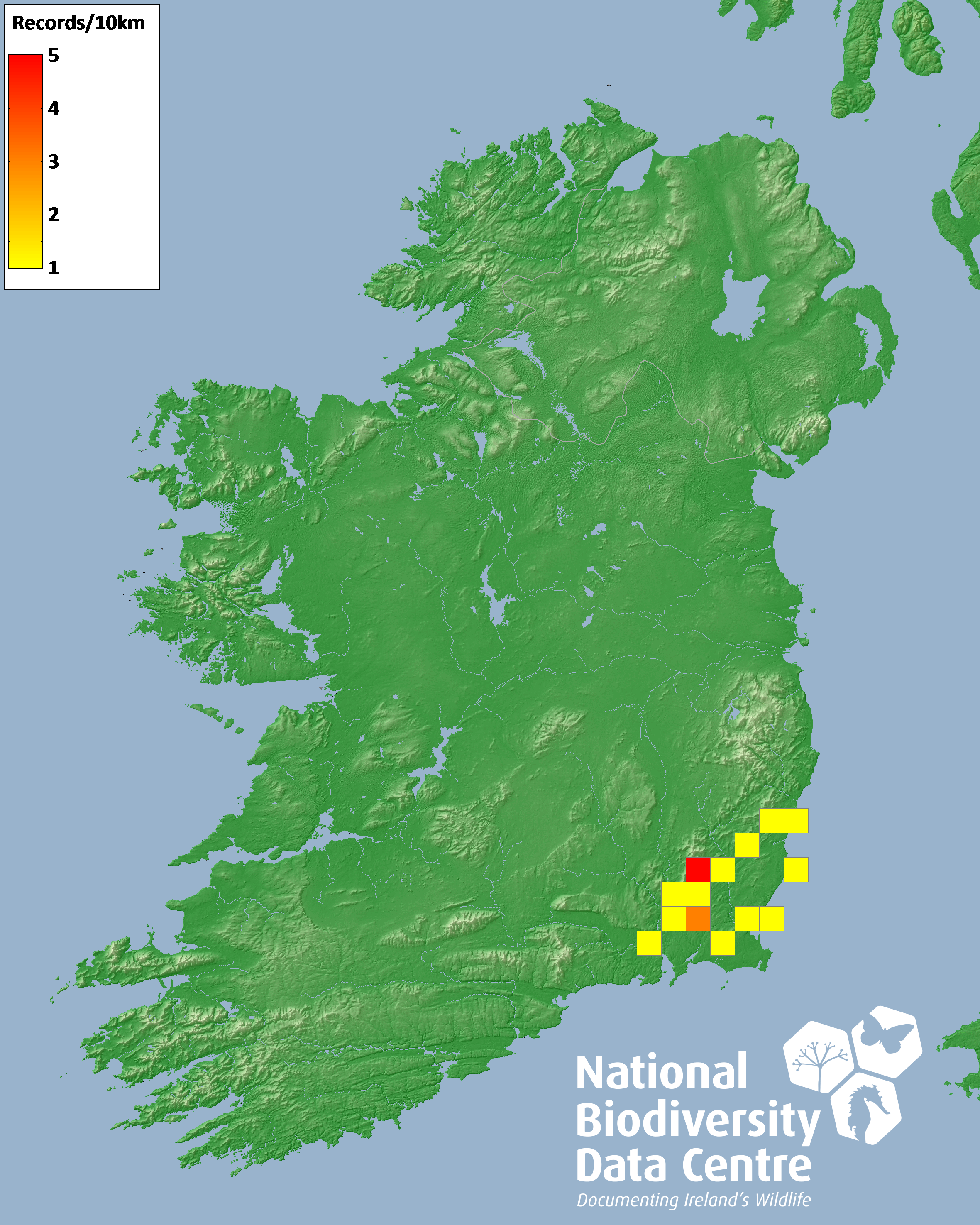 Distribution of the number of records recorded within each 10km grid square (ITM).Marine Map - 50km