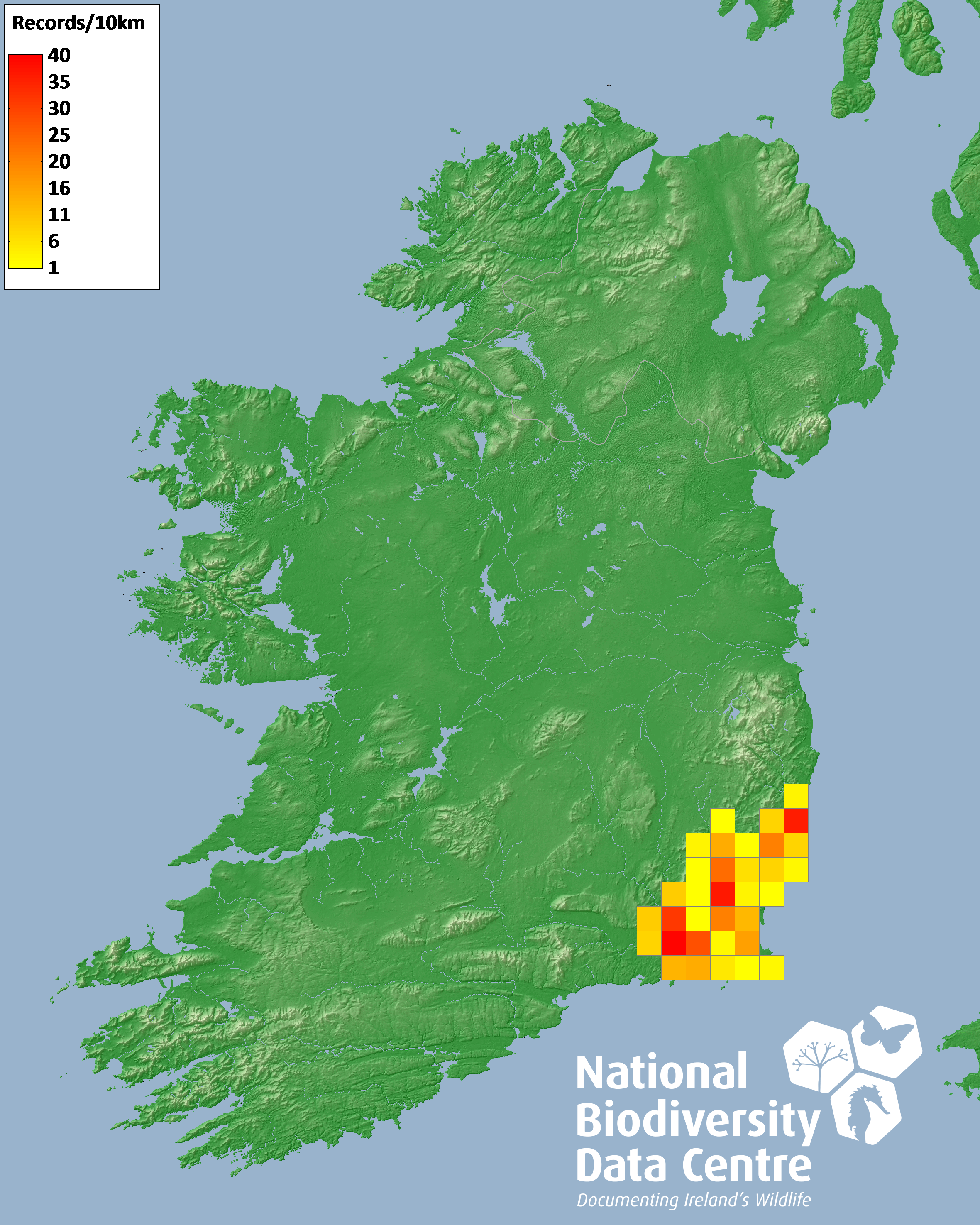 Distribution of the number of records recorded within each 10km grid square (ITM).Marine Map - 50km
