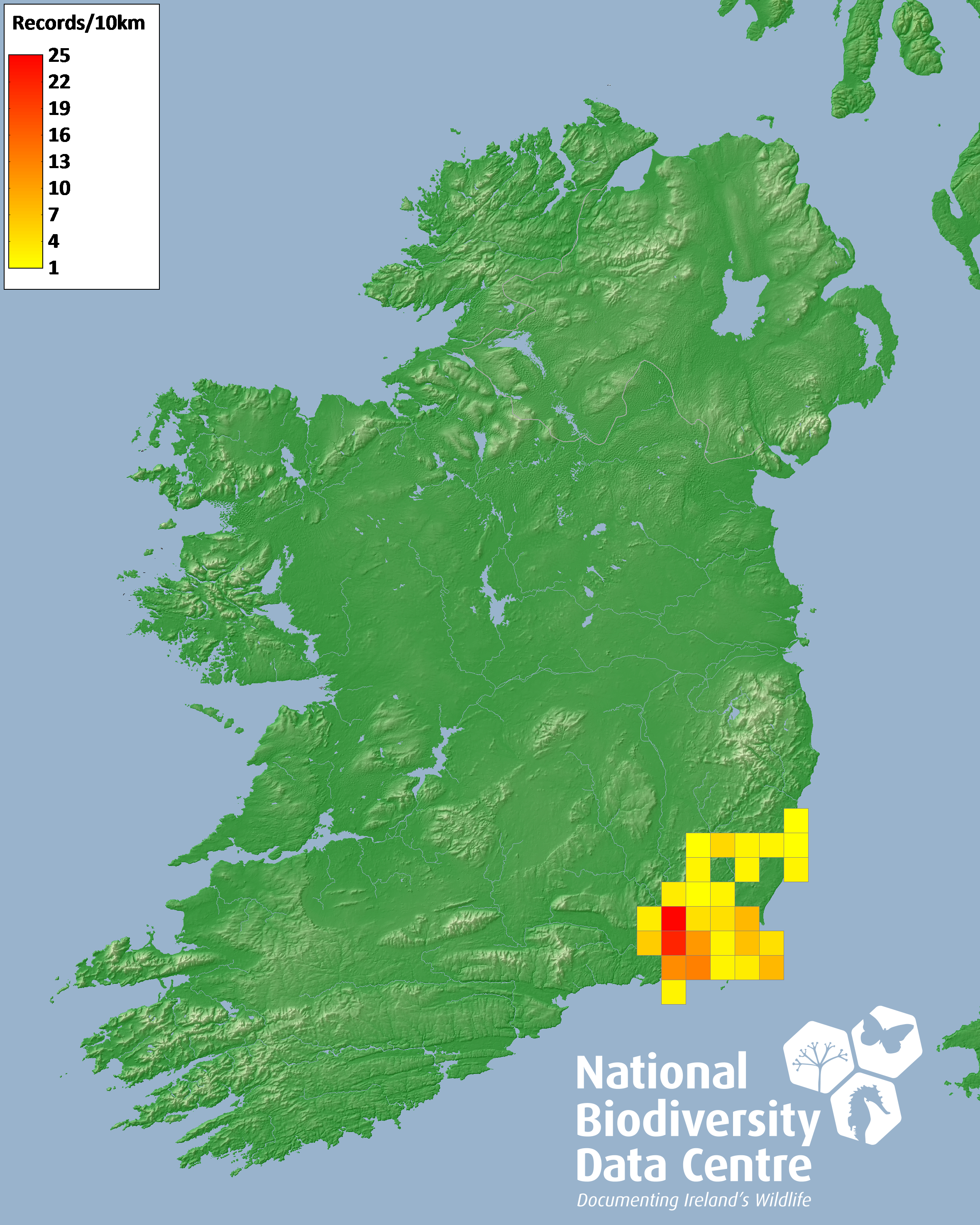 Distribution of the number of records recorded within each 10km grid square (ITM).Marine Map - 50km