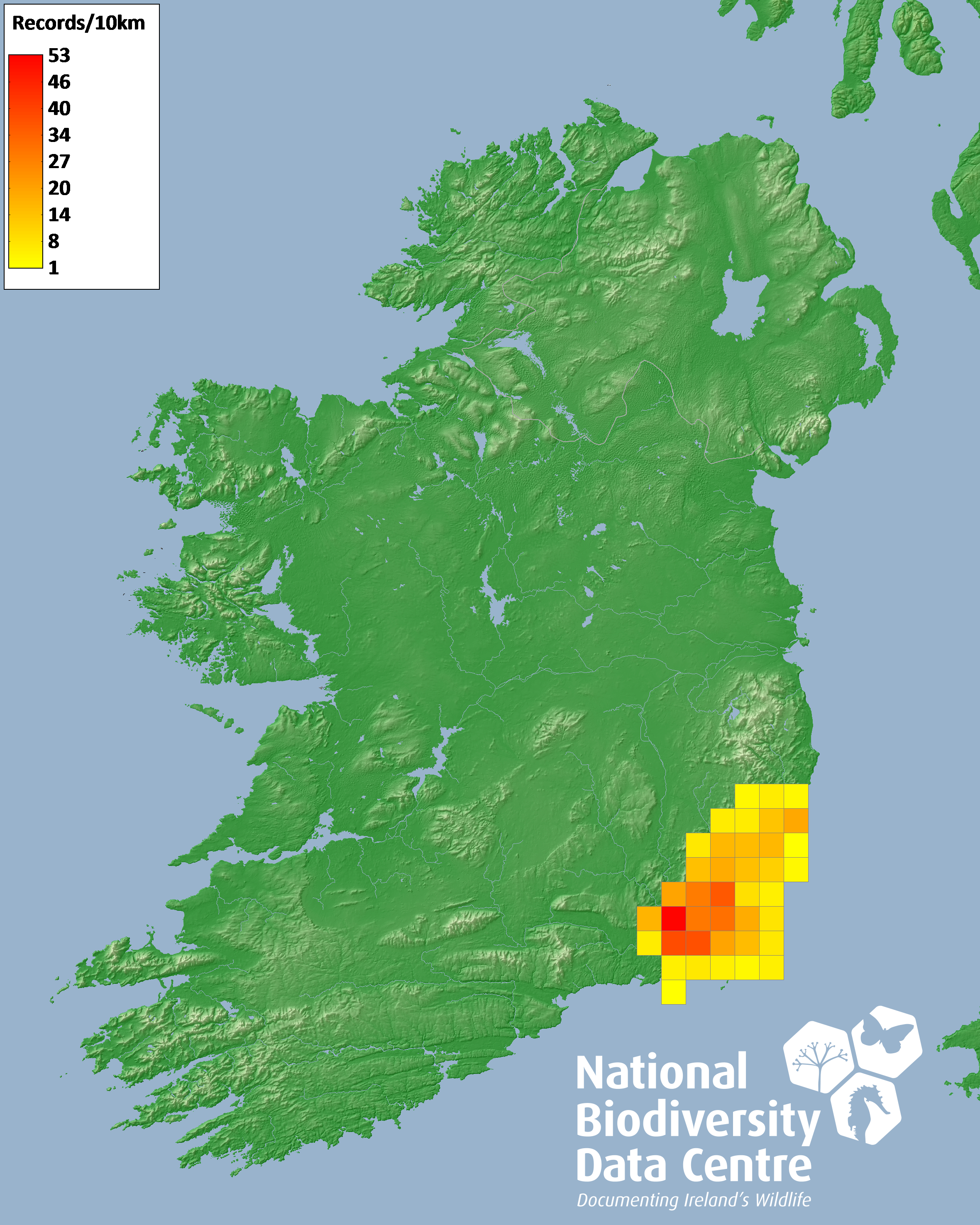 Distribution of the number of records recorded within each 10km grid square (ITM).Marine Map - 50km