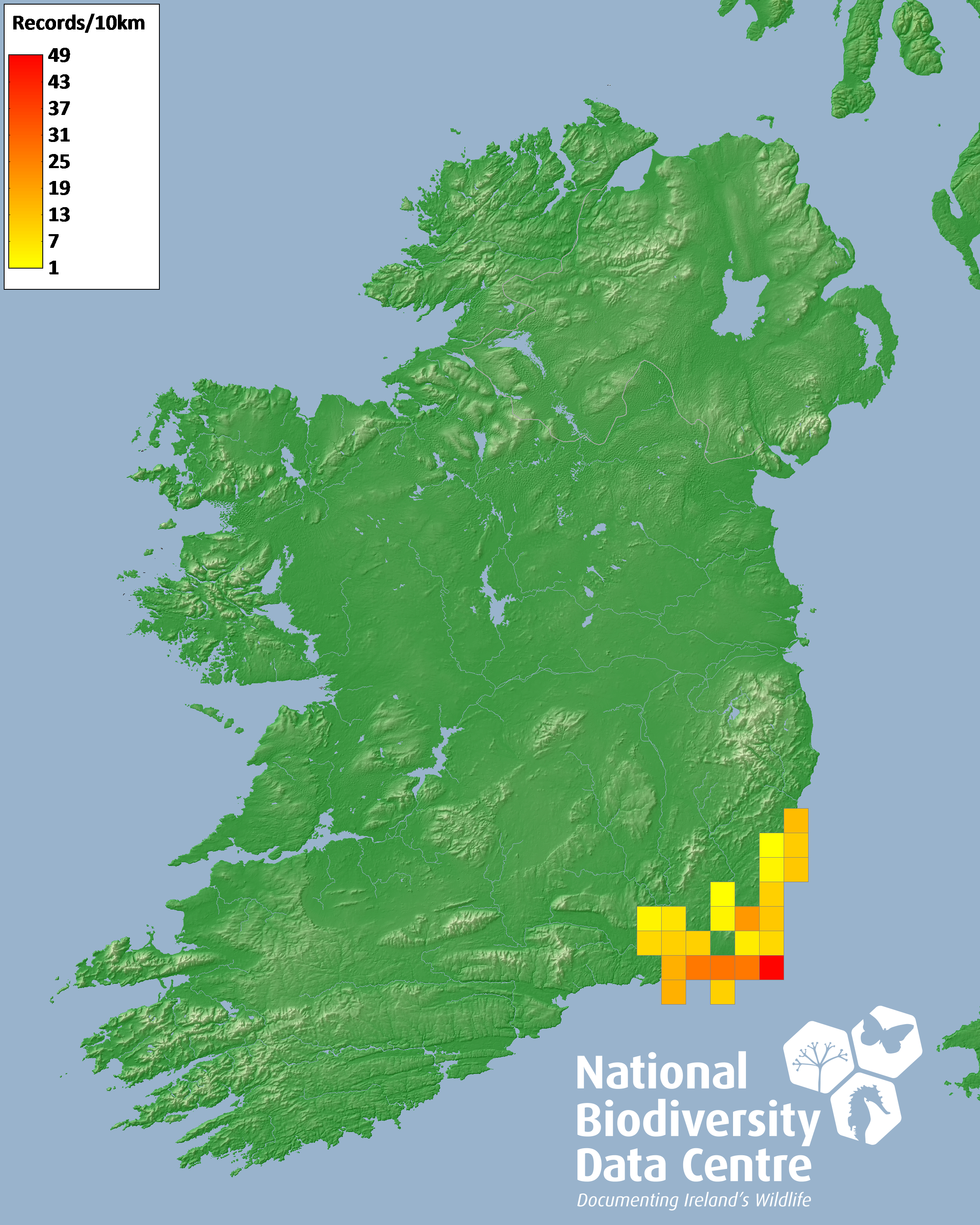 Distribution of the number of records recorded within each 10km grid square (ITM).Marine Map - 50km