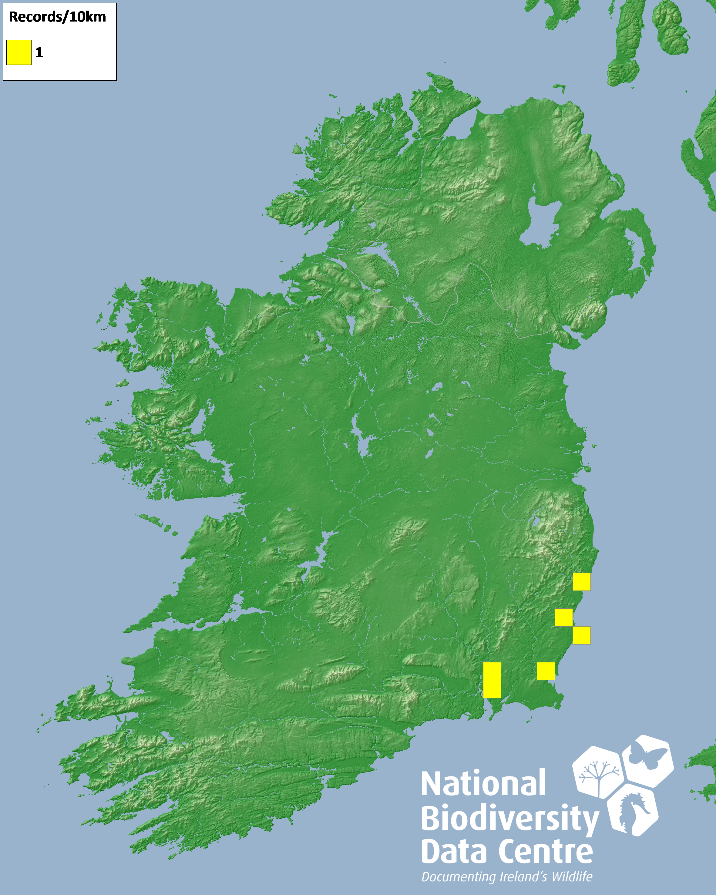 Distribution of the number of records recorded within each 10km grid square (ITM).Marine Map - 50km