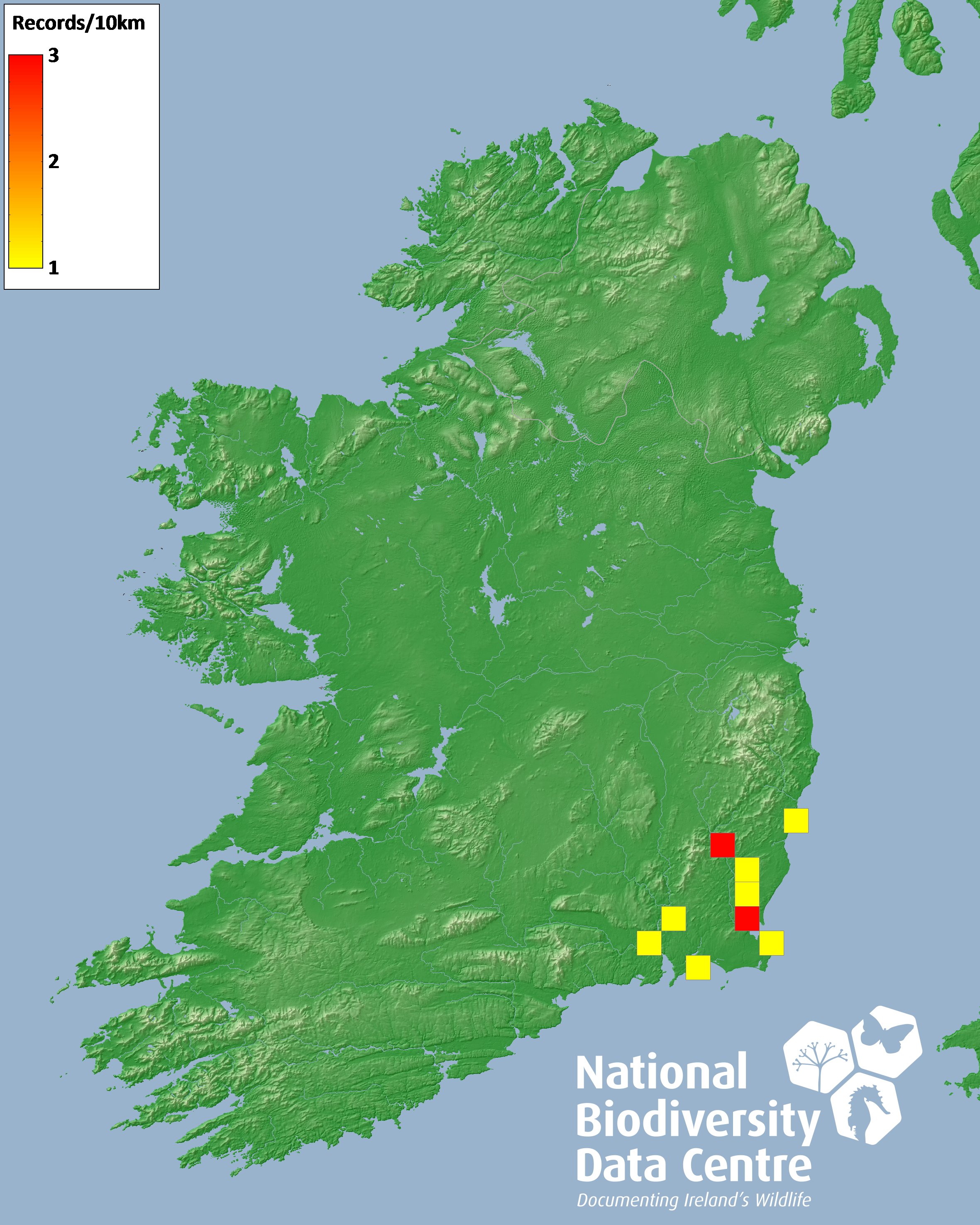 Distribution of the number of records recorded within each 10km grid square (ITM).Marine Map - 50km