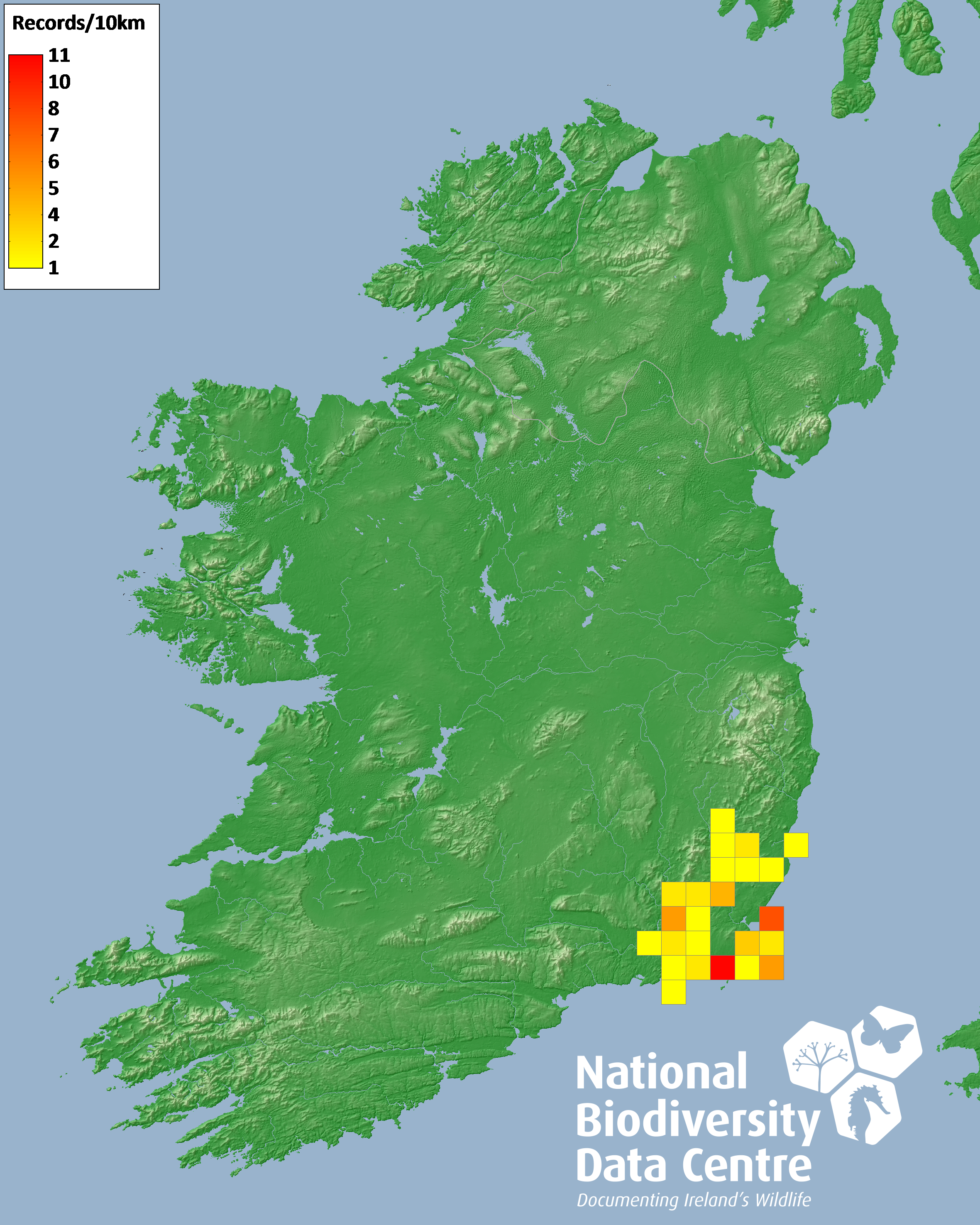 Distribution of the number of records recorded within each 10km grid square (ITM).Marine Map - 50km