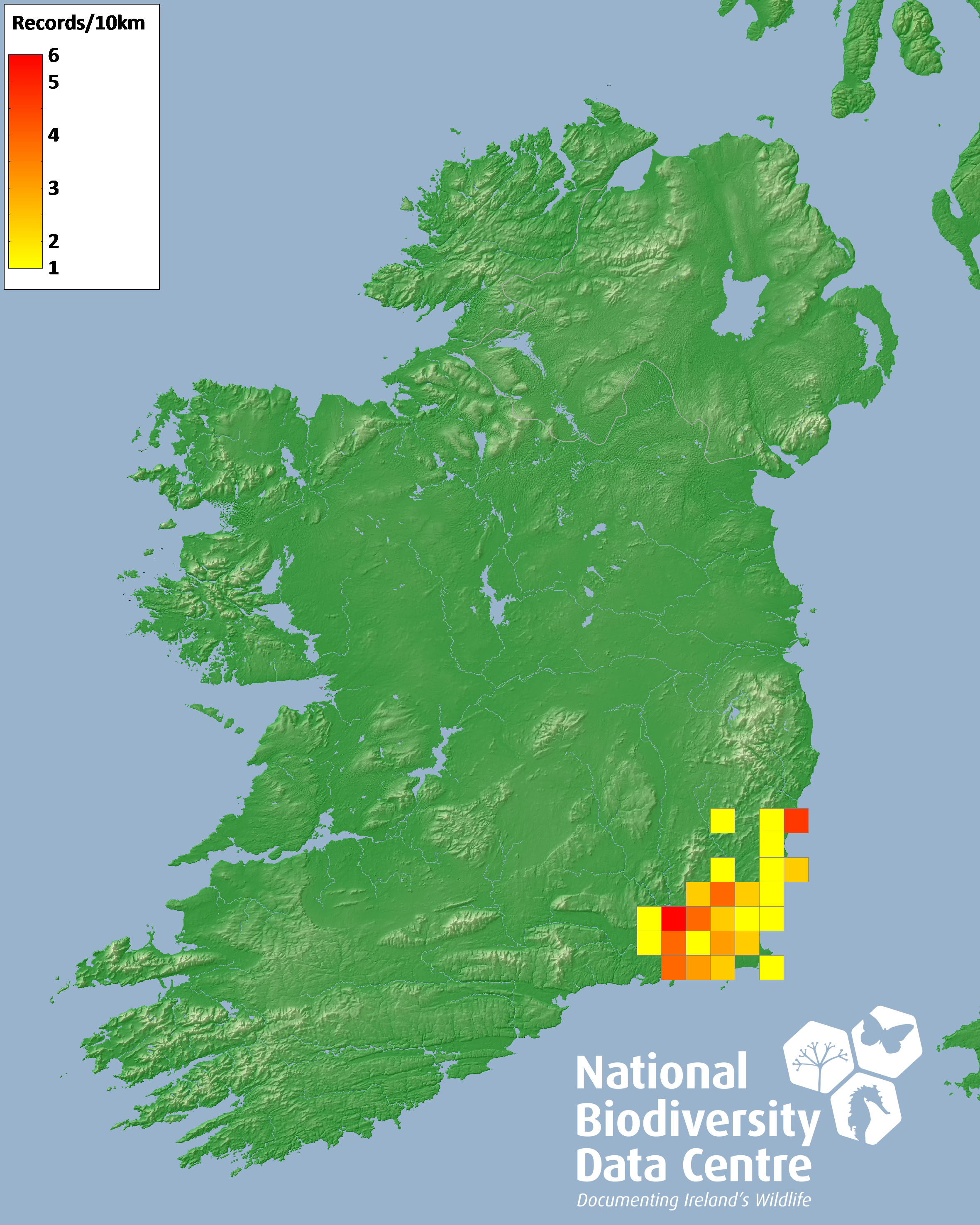 Distribution of the number of records recorded within each 10km grid square (ITM).Marine Map - 50km