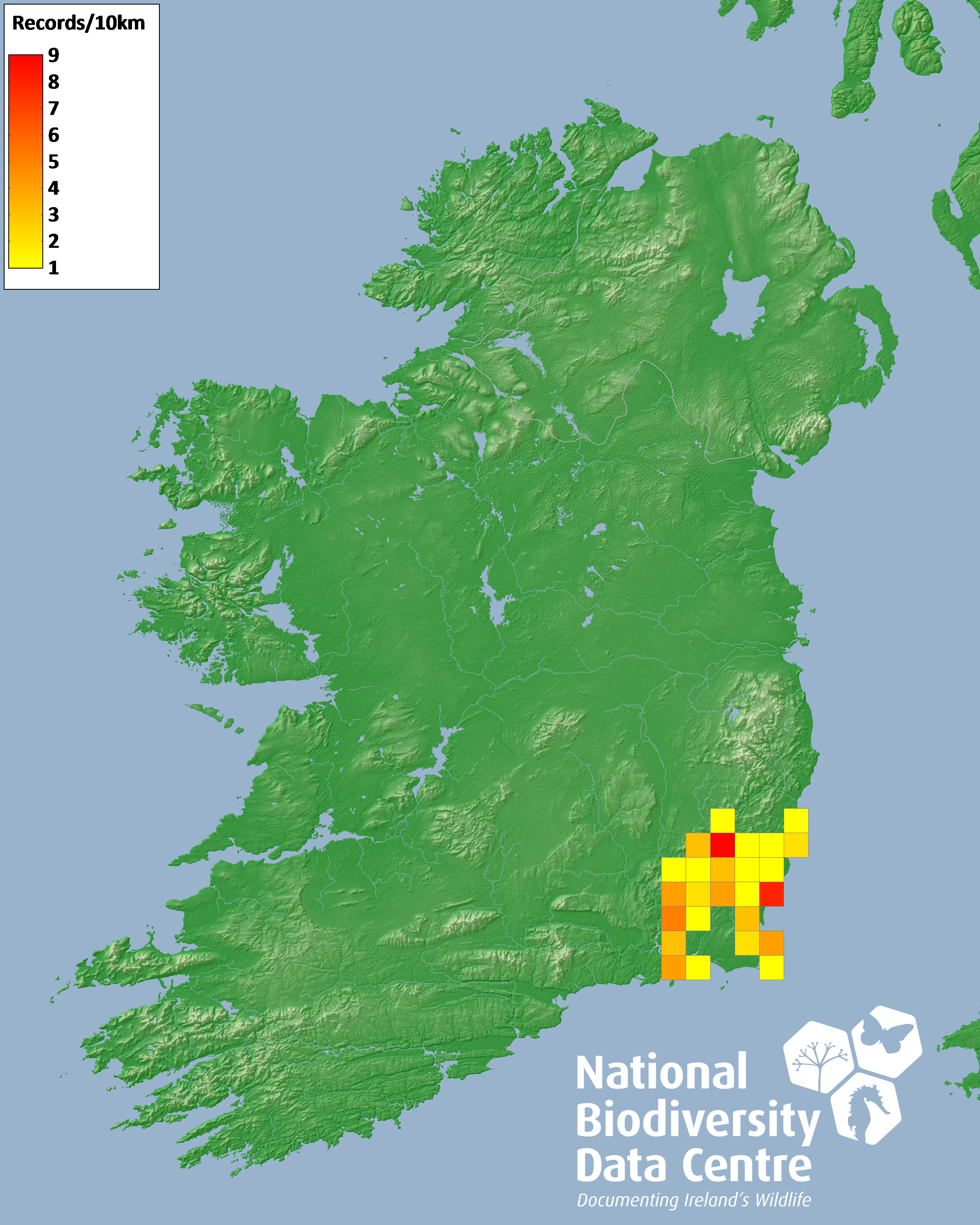 Distribution of the number of records recorded within each 10km grid square (ITM).Marine Map - 50km