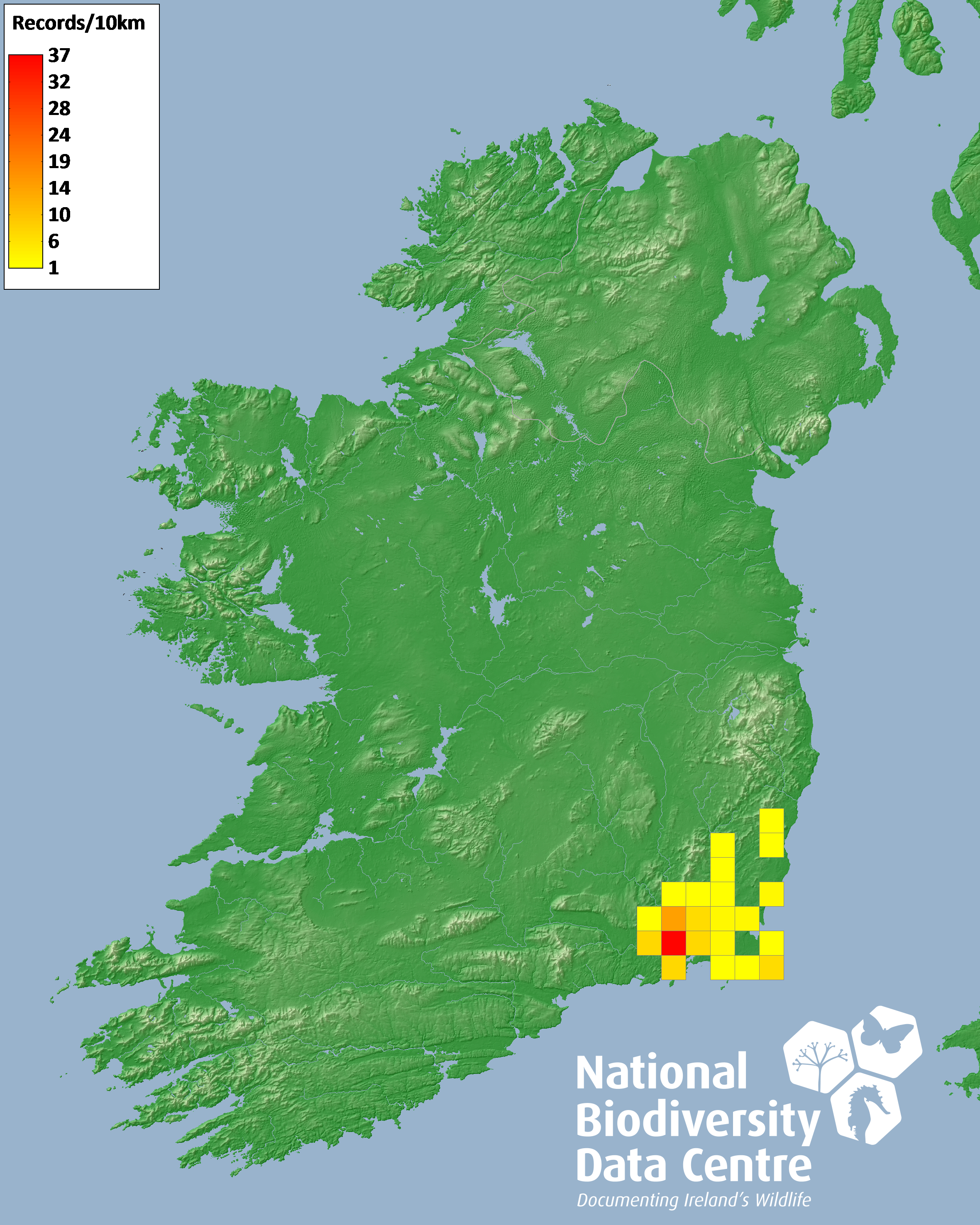 Distribution of the number of records recorded within each 10km grid square (ITM).Marine Map - 50km