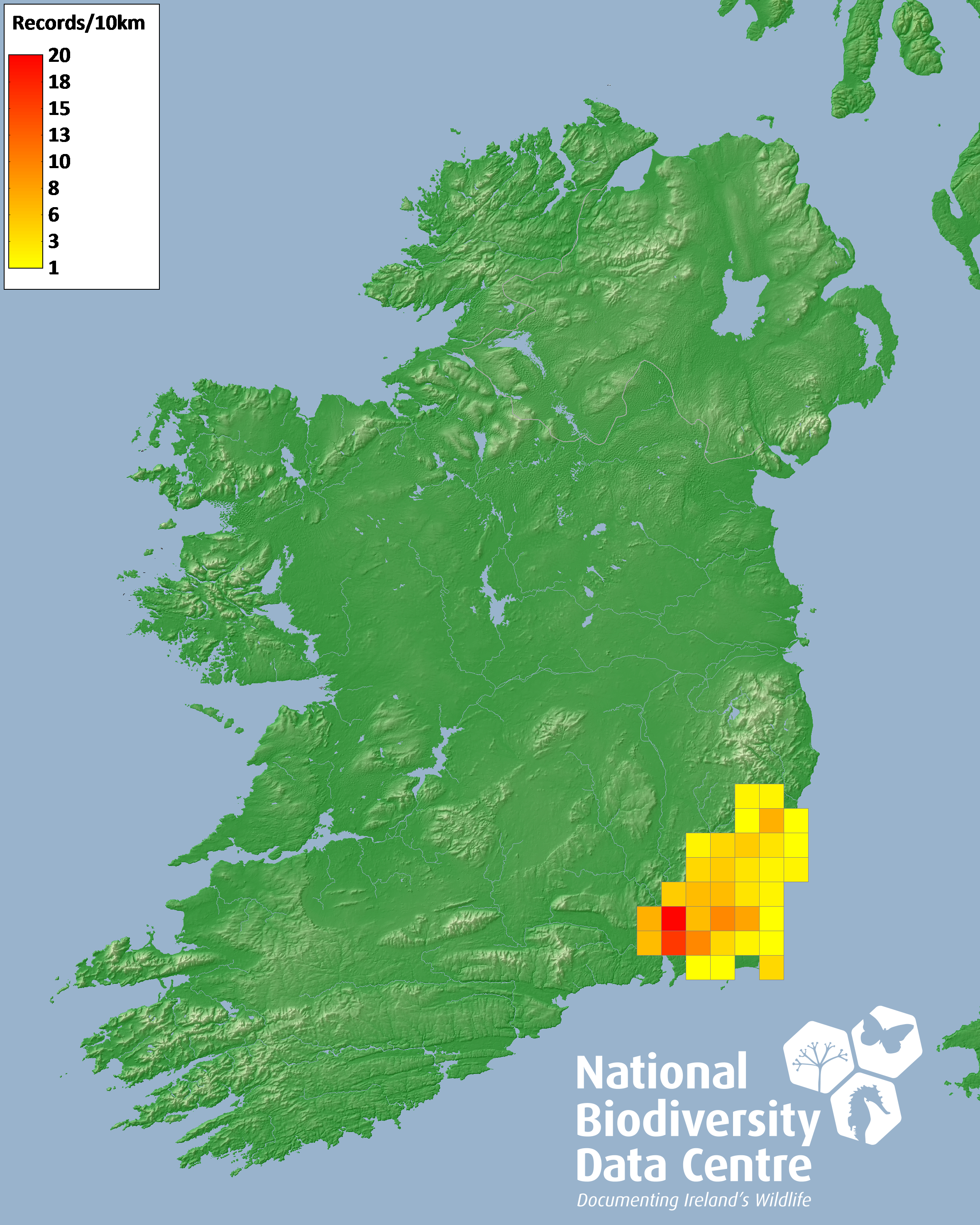 Distribution of the number of records recorded within each 10km grid square (ITM).Marine Map - 50km