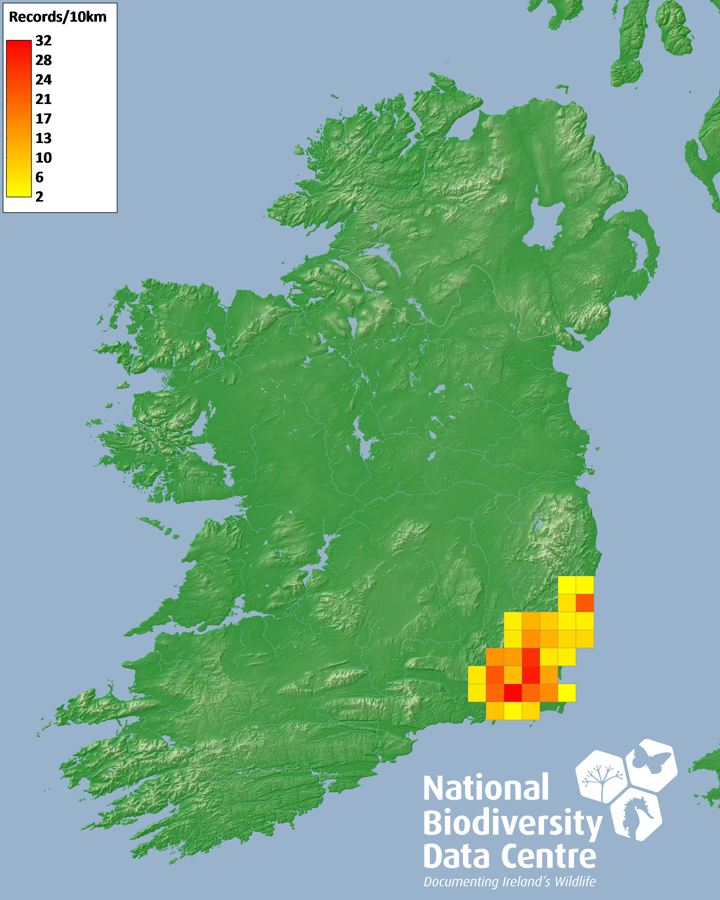 Distribution of the number of records recorded within each 10km grid square (ITM).Marine Map - 50km