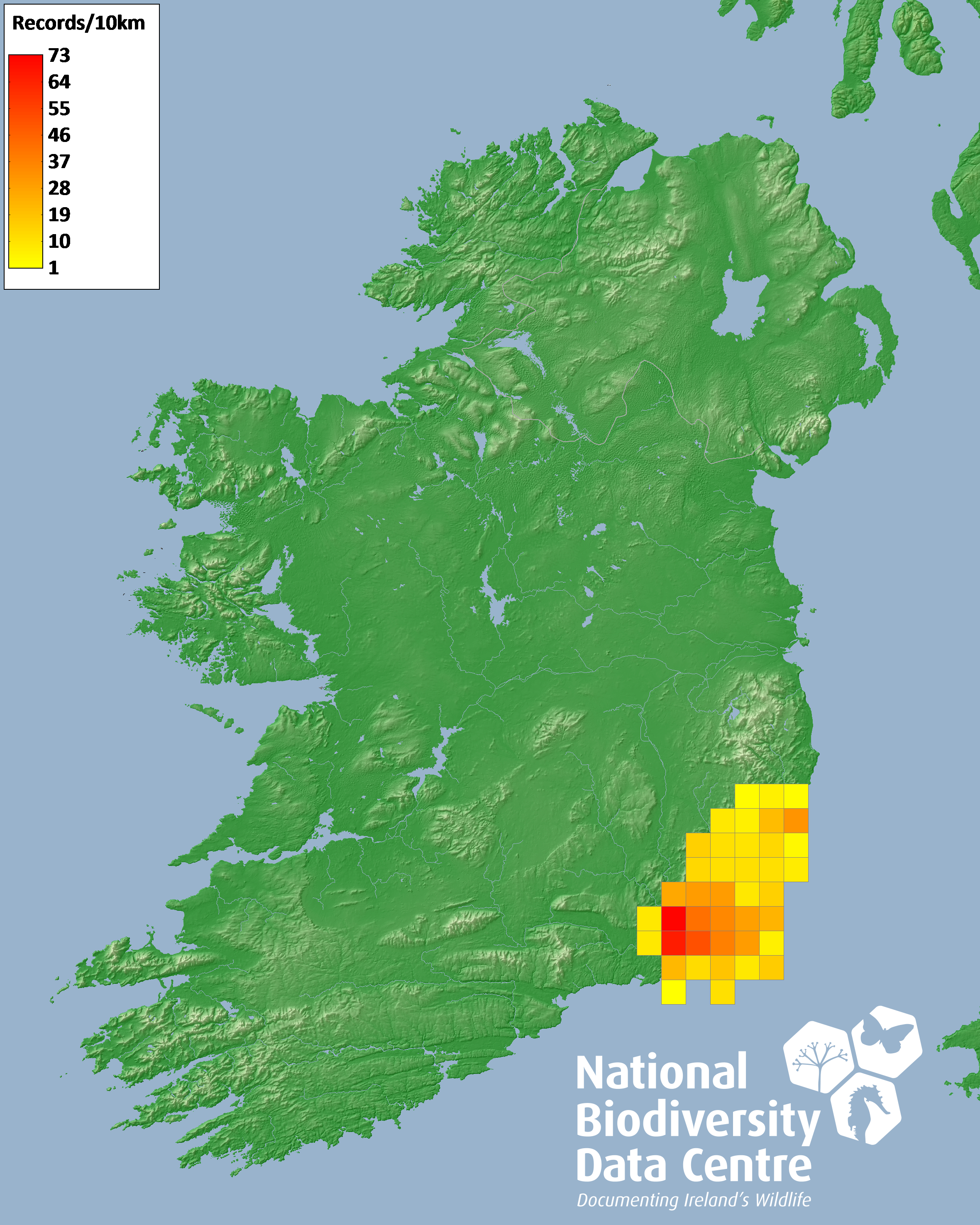 Distribution of the number of records recorded within each 10km grid square (ITM).Marine Map - 50km