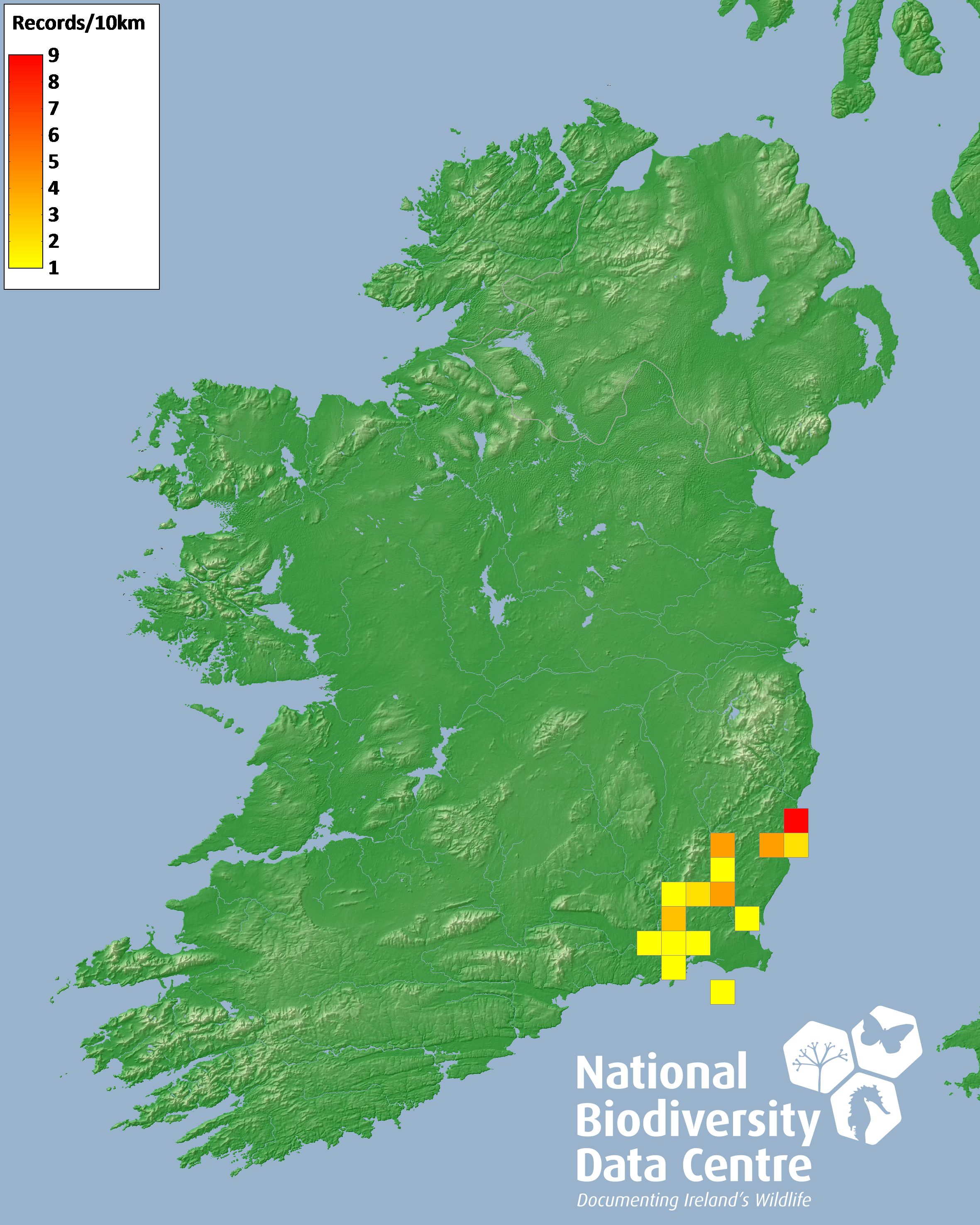Distribution of the number of records recorded within each 10km grid square (ITM).Marine Map - 50km