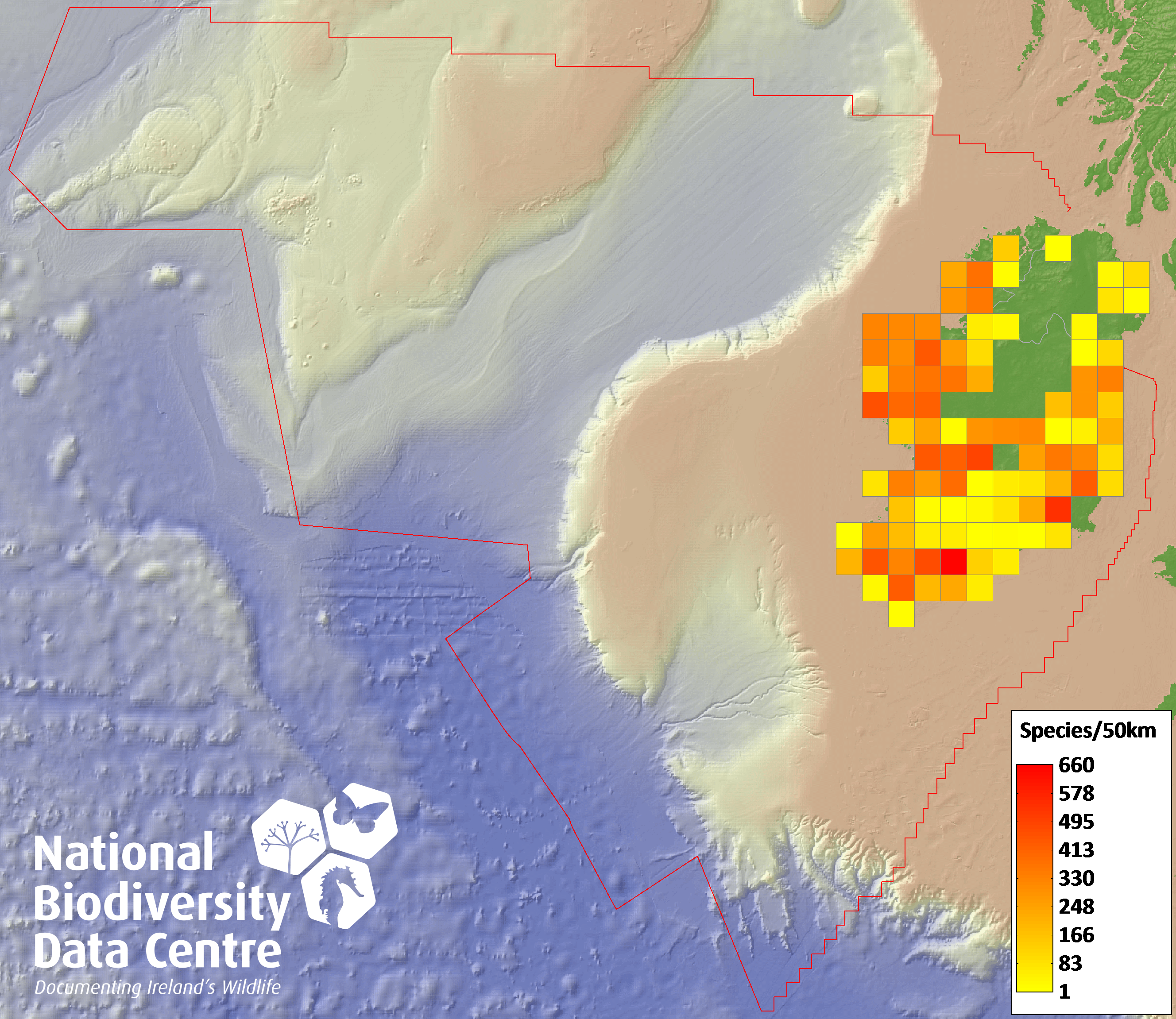 Distribution of the number of species recorded within each 10km grid square (ITM).Marine Map - 50Km
