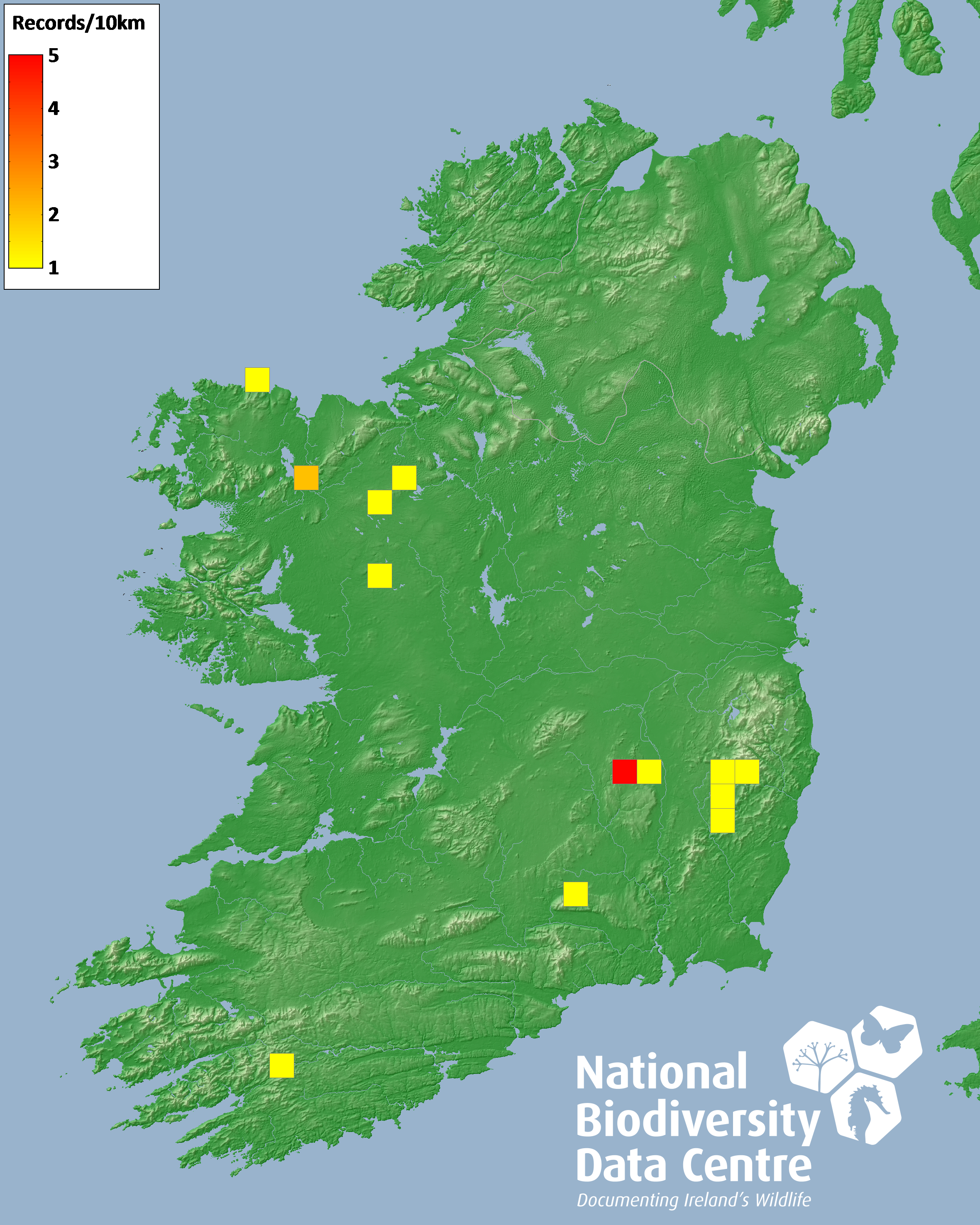 Distribution of the number of records recorded within each 10km grid square (ITM).Marine Map - 50km