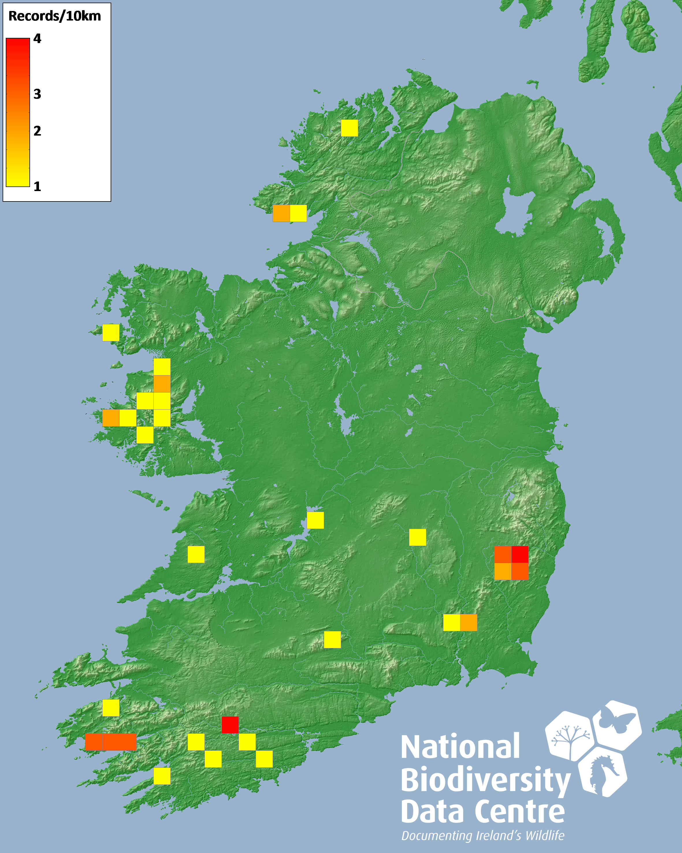 Distribution of the number of records recorded within each 10km grid square (ITM).Marine Map - 50km