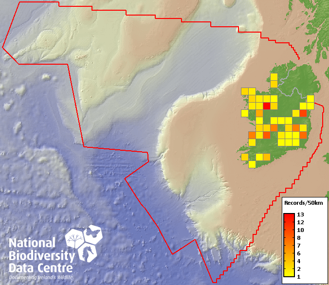 Distribution of the number of records recorded within each 10km grid square (ITM).Marine Map - 50km