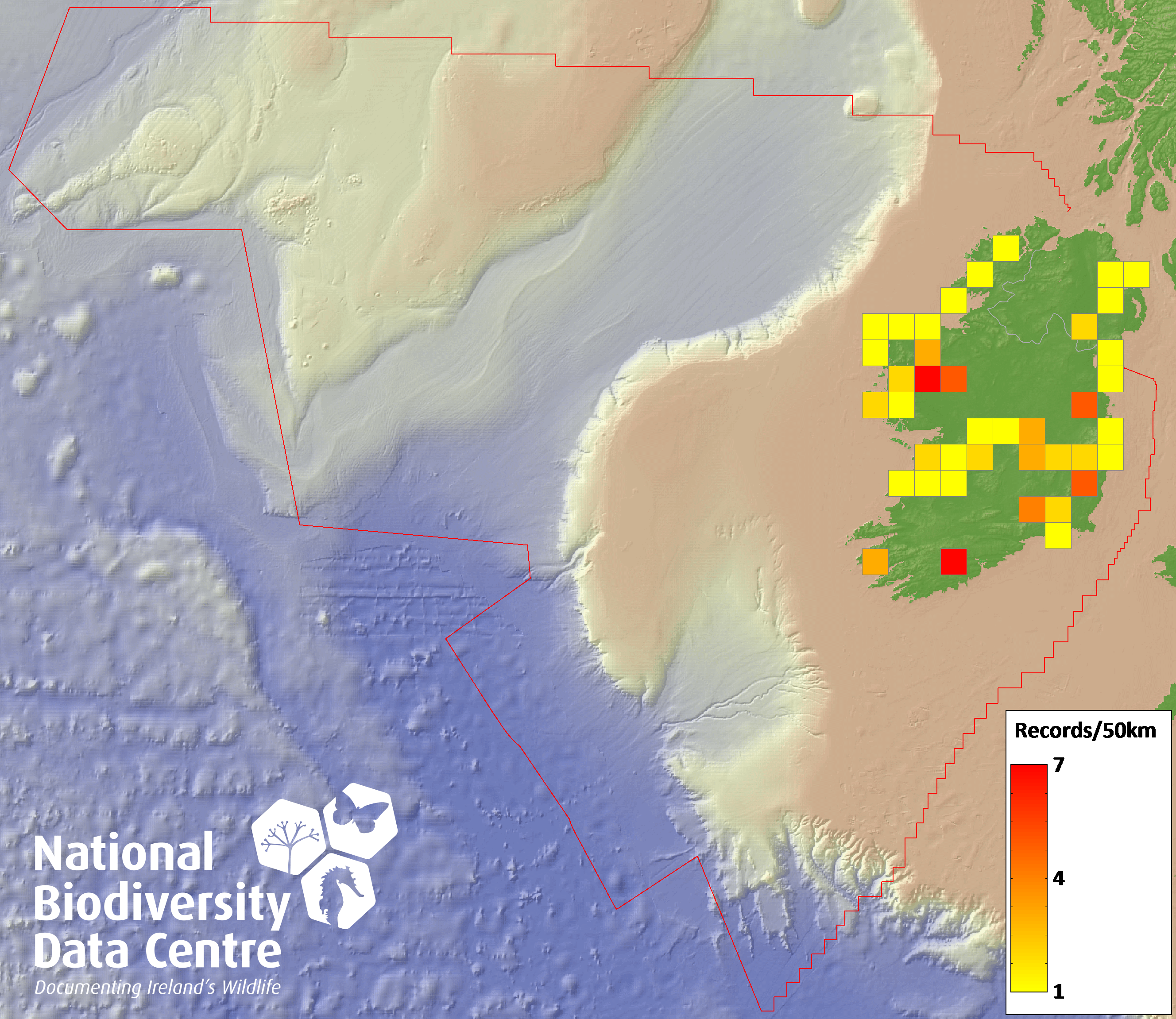 Distribution of the number of records recorded within each 10km grid square (ITM).Marine Map - 50km