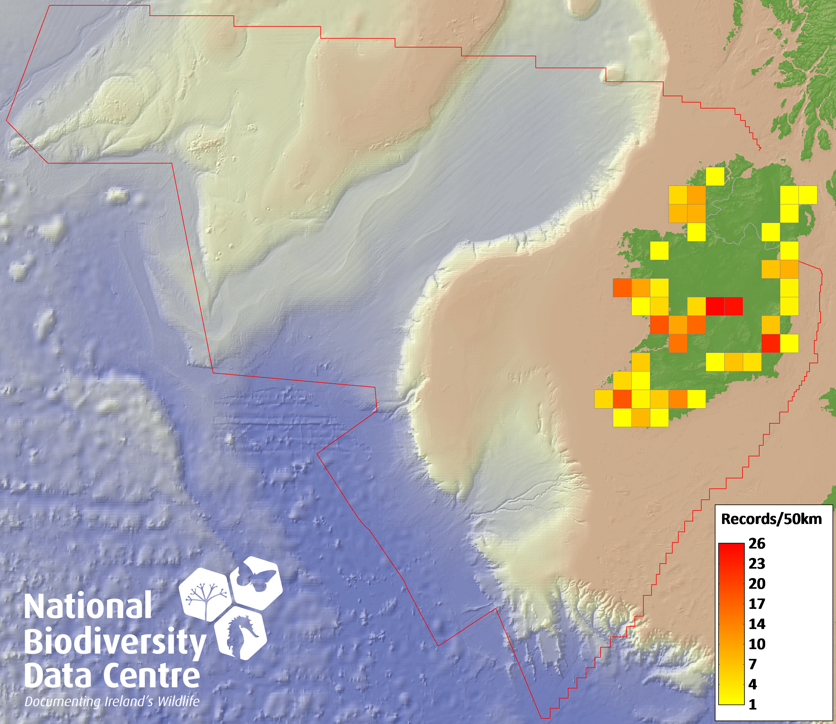 Distribution of the number of records recorded within each 10km grid square (ITM).Marine Map - 50km