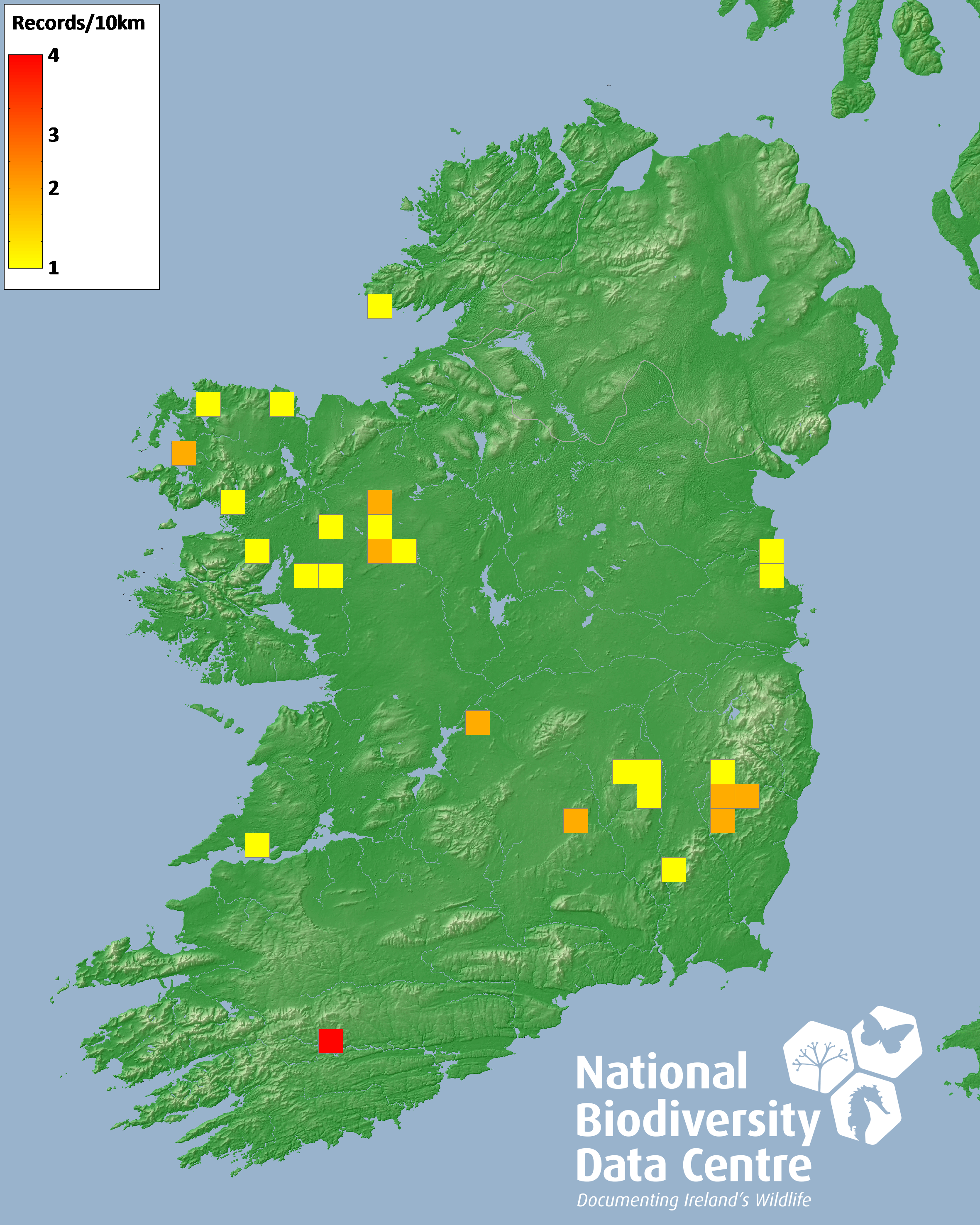 Distribution of the number of records recorded within each 10km grid square (ITM).Marine Map - 50km