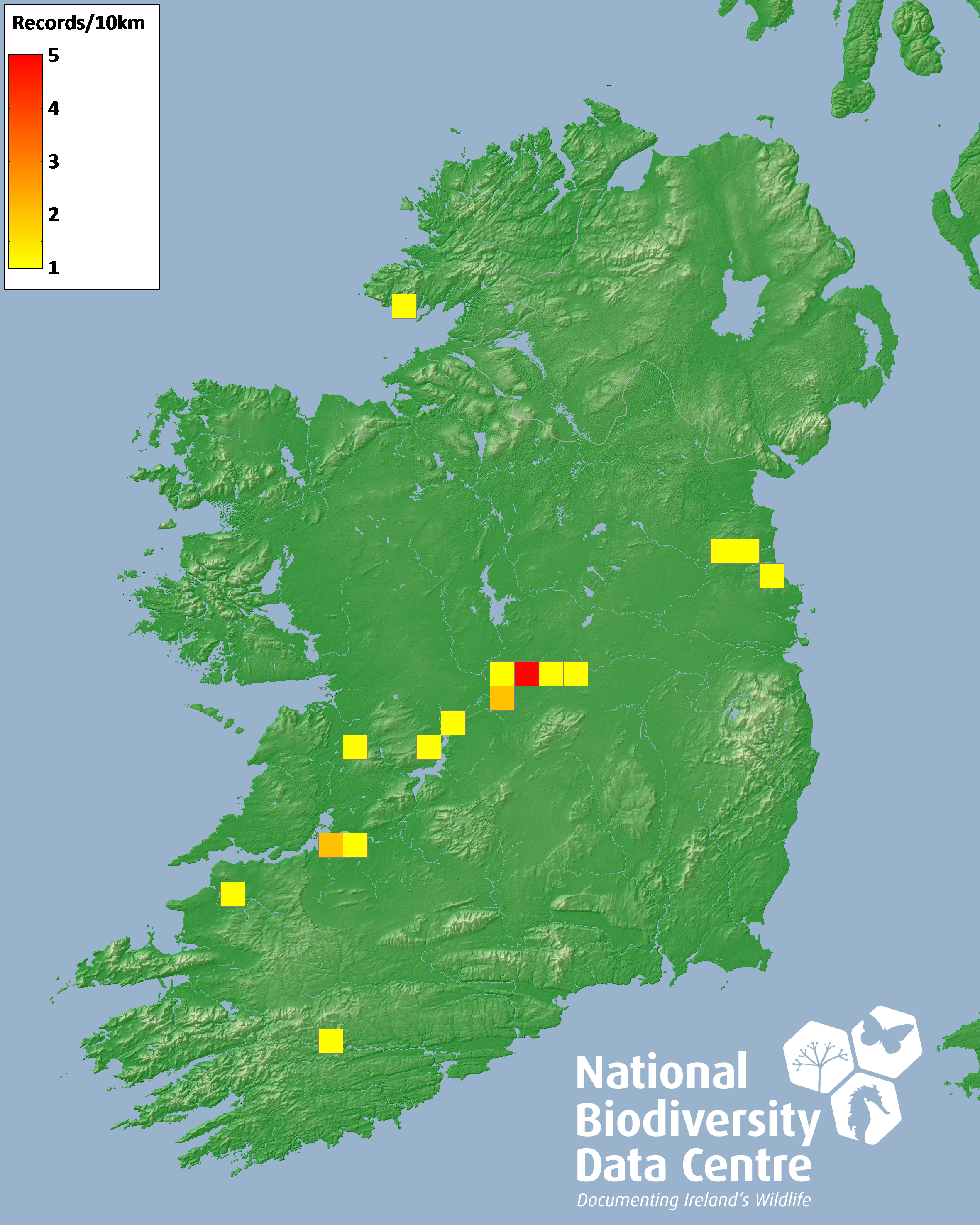 Distribution of the number of records recorded within each 10km grid square (ITM).Marine Map - 50km