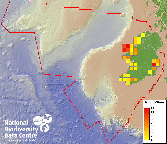 Distribution of the number of records recorded within each 10km grid square (ITM).Marine Map - 50km