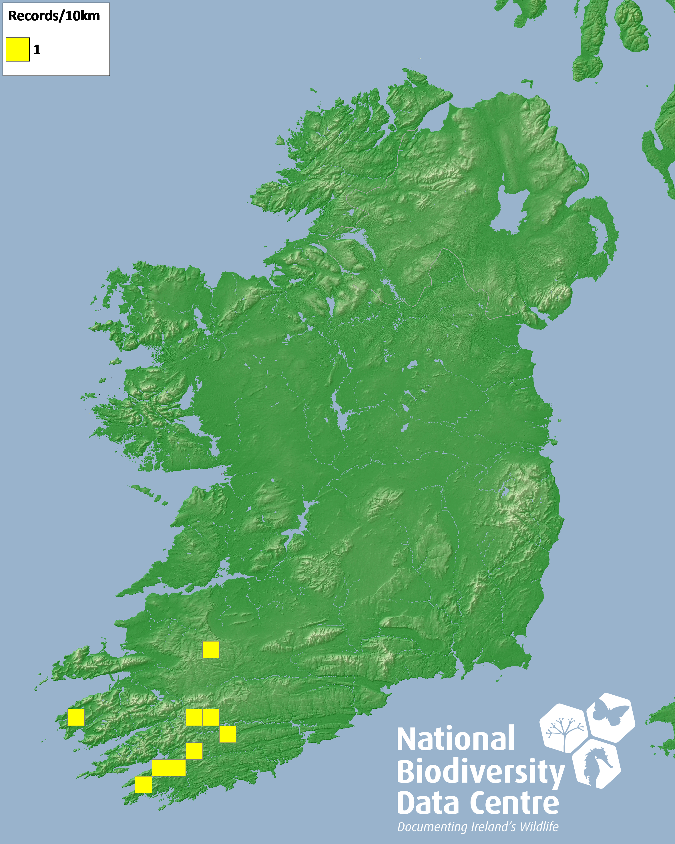 Distribution of the number of records recorded within each 10km grid square (ITM).Marine Map - 50km