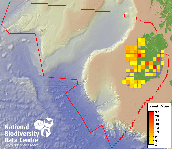 Distribution of the number of records recorded within each 10km grid square (ITM).Marine Map - 50km