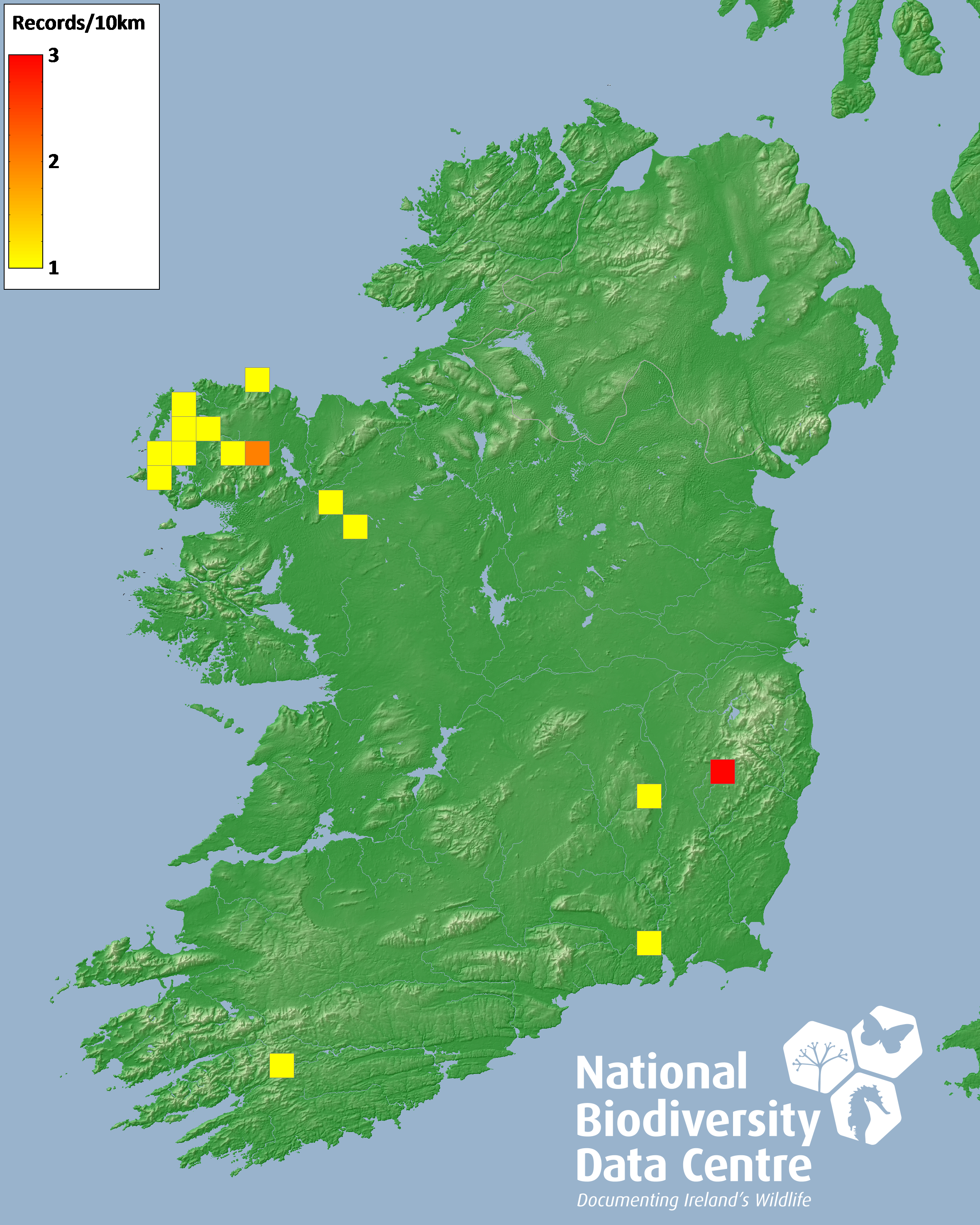 Distribution of the number of records recorded within each 10km grid square (ITM).Marine Map - 50km